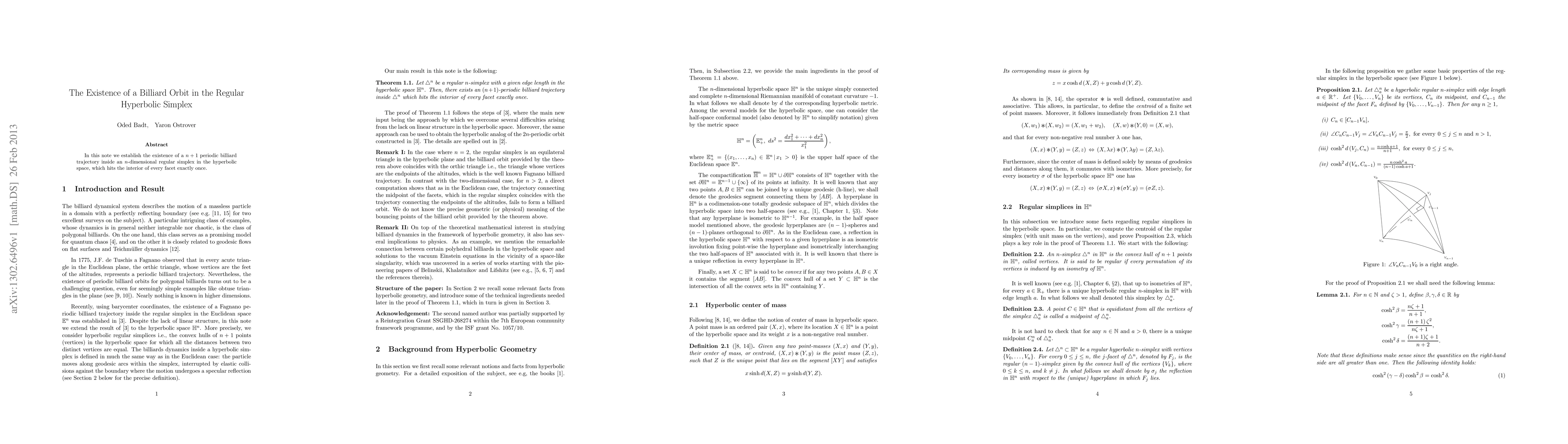 Summary: This paper establishes the existence of a (n+1)-periodic billiard orbit within an n-dimensional regular simplex in hyperbolic space, demonstrating that it intersects the interior of each facet precisely once. The result provides insight into the dynamics of billiards in hyperbolic simplices.