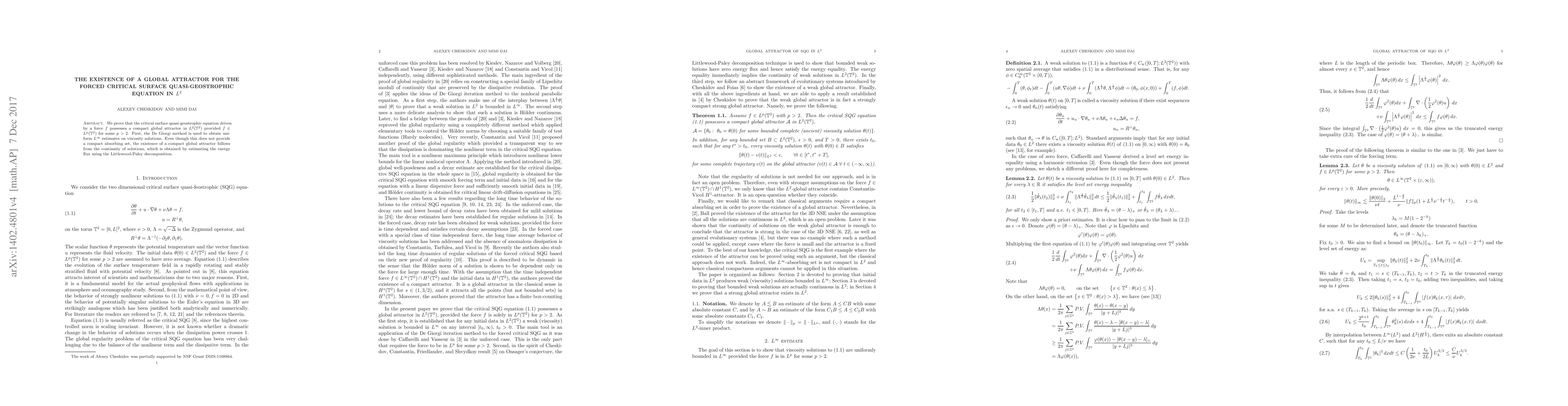 Summary: The paper proves the existence of a compact global attractor for the forced critical surface quasi-geostrophic equation in $L^2(\mathbb T^2)$ when the driving force $f$ belongs to $L^p(\mathbb T^2)$ for some $p>2$. The De Giorgi method and Littlewood-Paley decomposition are utilized to establish uniform $L^\infty$ estimates and continuity of solutions, respectively.