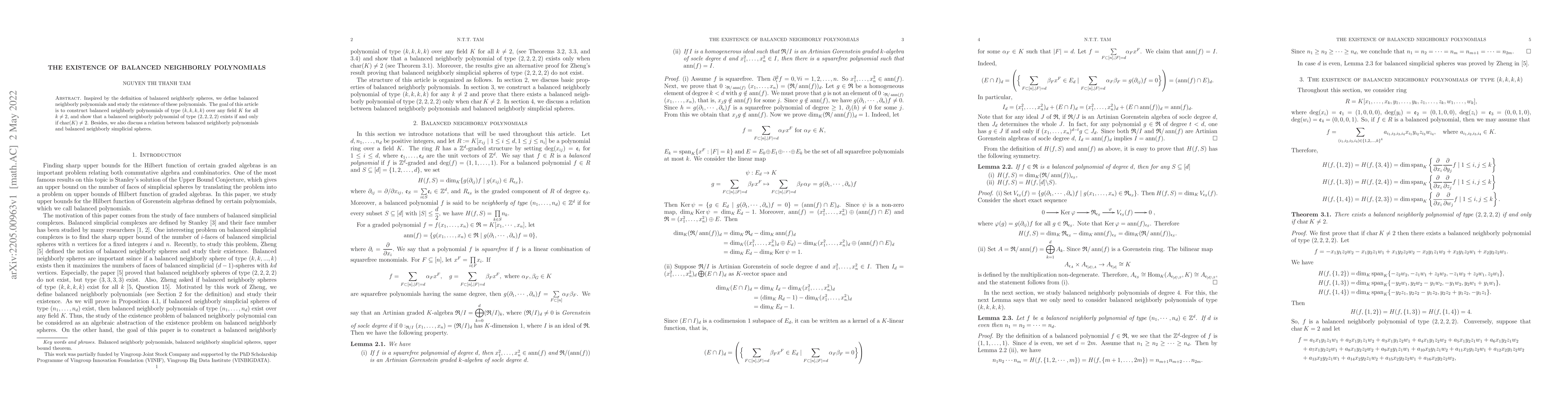 This paper explores the existence of balanced neighborly polynomials, defined analogously to balanced neighborly spheres, and constructs such polynomials of type $(k,k,k,k)$ for any field $K$ when $k \neq 2$. It also establishes the existence condition for a type $(2,2,2,2)$ polynomial depending on the field's characteristic, specifically that it must not be 2. Additionally, it examines the connection between these polynomials and balanced neighborly simplicial spheres.