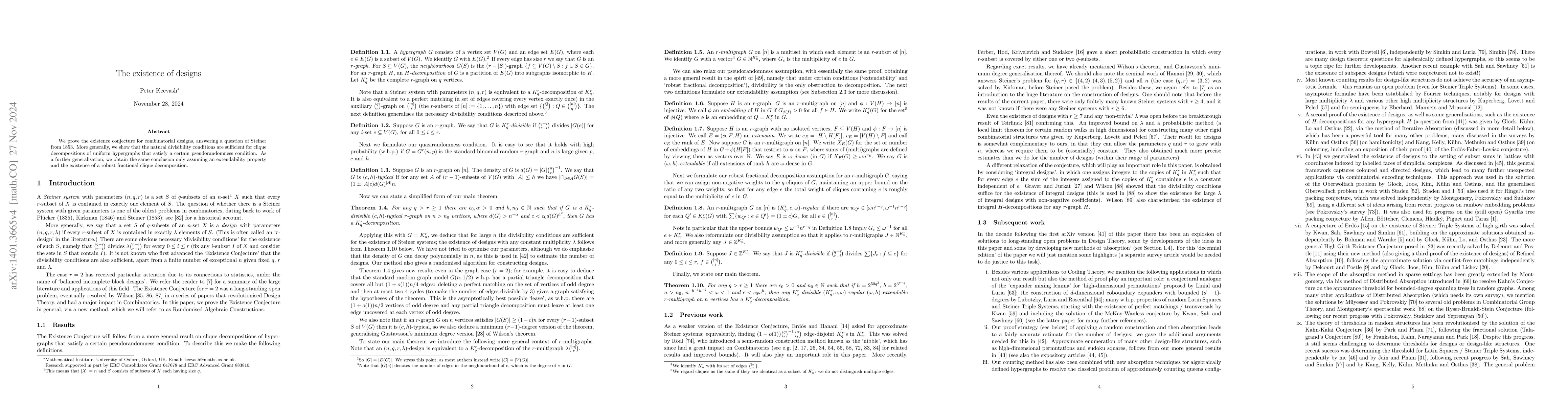 This paper proves the existence conjecture for combinatorial designs, resolving a 1853 question by Steiner. It also demonstrates that divisibility conditions suffice for clique decompositions in pseudorandom simplicial complexes. Additionally, it generalizes the result to cases relying on extendability and robust fractional clique decompositions.