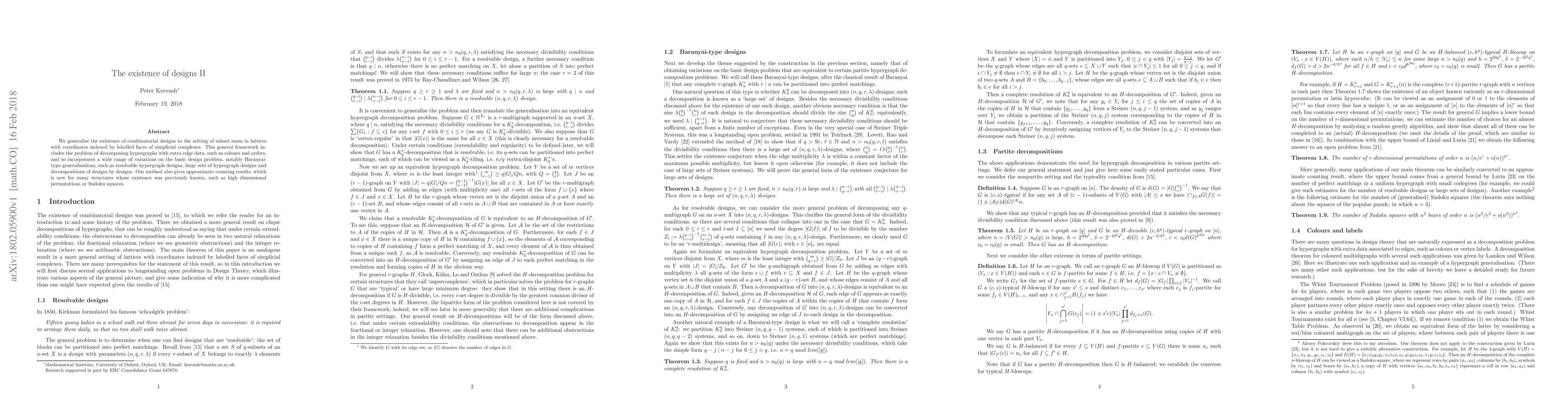 We generalise the existence of combinatorial designs to the setting of subset sums in lattices with coordinates indexed by labelled faces of simplicial complexes. This general framework includes the problem of decomposing hypergraphs with extra edge data, such as colours and orders, and so incorporates a wide range of variations on the basic design problem, notably Baranyai-type generalisations, such as resolvable hypergraph designs, large sets of hypergraph designs and decompositions of designs by designs. Our method also gives approximate counting results, which is new for many structures whose existence was previously known, such as high dimensional permutations or Sudoku squares.