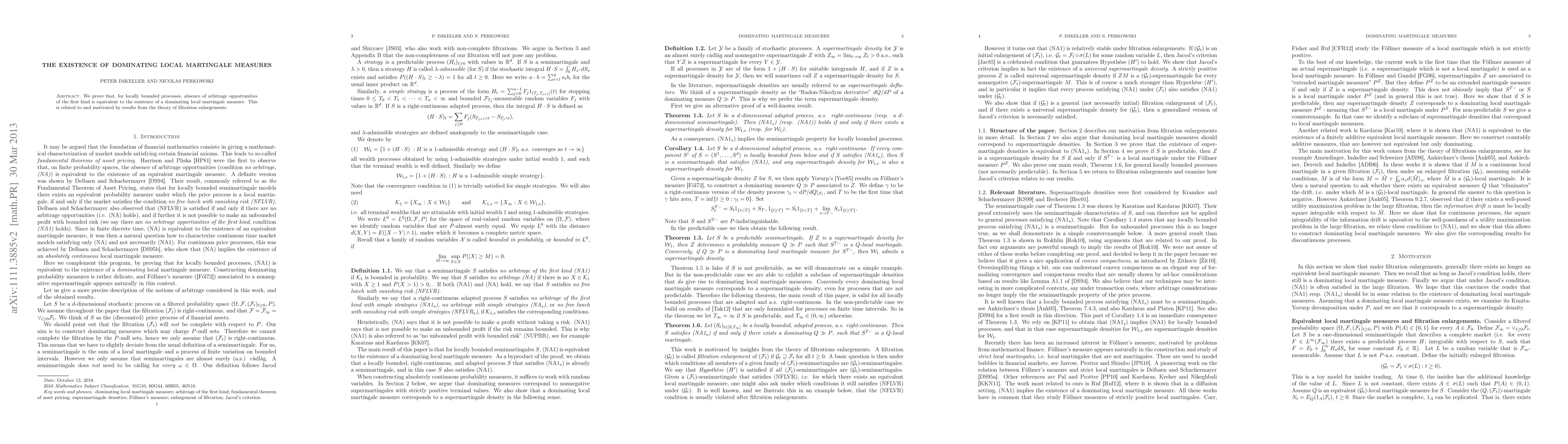 We prove that, for locally bounded processes, absence of arbitrage opportunities of the first kind is equivalent to the existence of a dominating local martingale measure. This is related to and motivated by results from the theory of filtration enlargements.