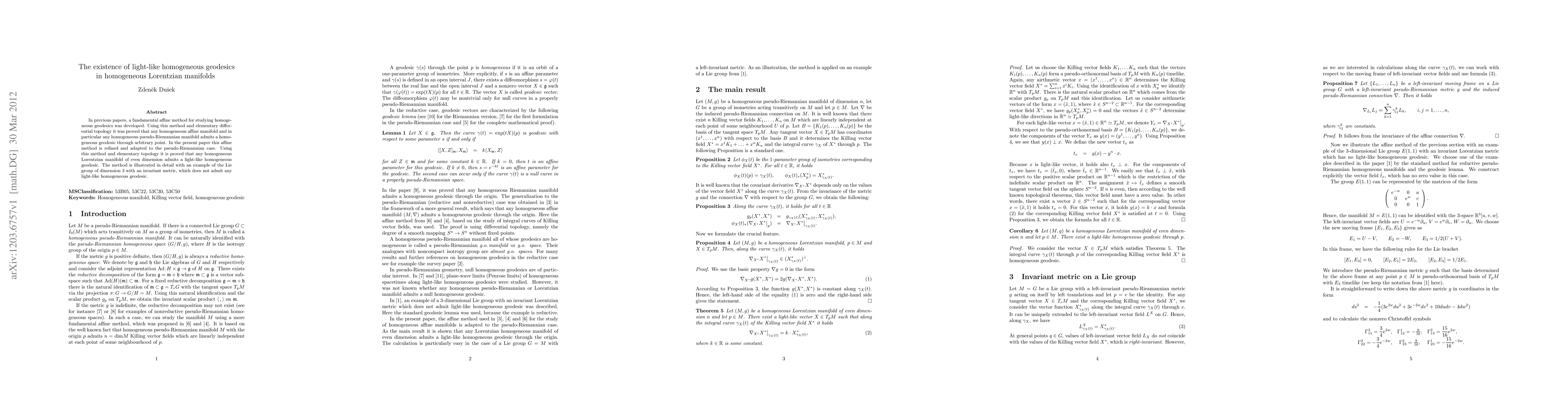 In previous papers, a fundamental affine method for studying homogeneous geodesics was developed. Using this method and elementary differential topology it was proved that any homogeneous affine manifold and in particular any homogeneous pseudo-Riemannian manifold admits a homogeneous geodesic through arbitrary point. In the present paper this affine method is refined and adapted to the pseudo-Riemannian case. Using this method and elementary topology it is proved that any homogeneous Lorentzian manifold of even dimension admits a light-like homogeneous geodesic. The method is illustrated in detail with an example of the Lie group of dimension 3 with an invariant metric, which does not admit any light-like homogeneous geodesic.