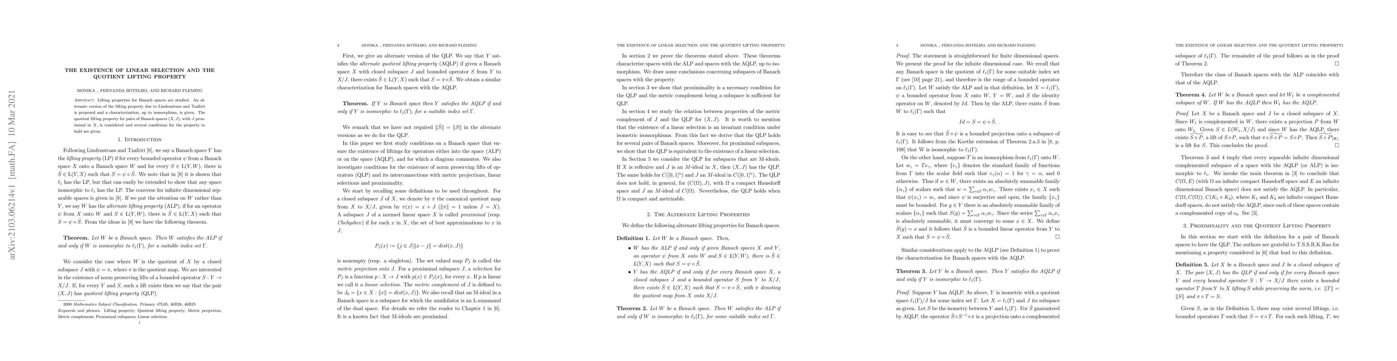 This paper proposes an alternate version of the lifting property in Banach spaces and characterizes it up to isomorphism. It also examines the quotient lifting property for pairs where the subspace is proximinal, providing conditions for its existence.