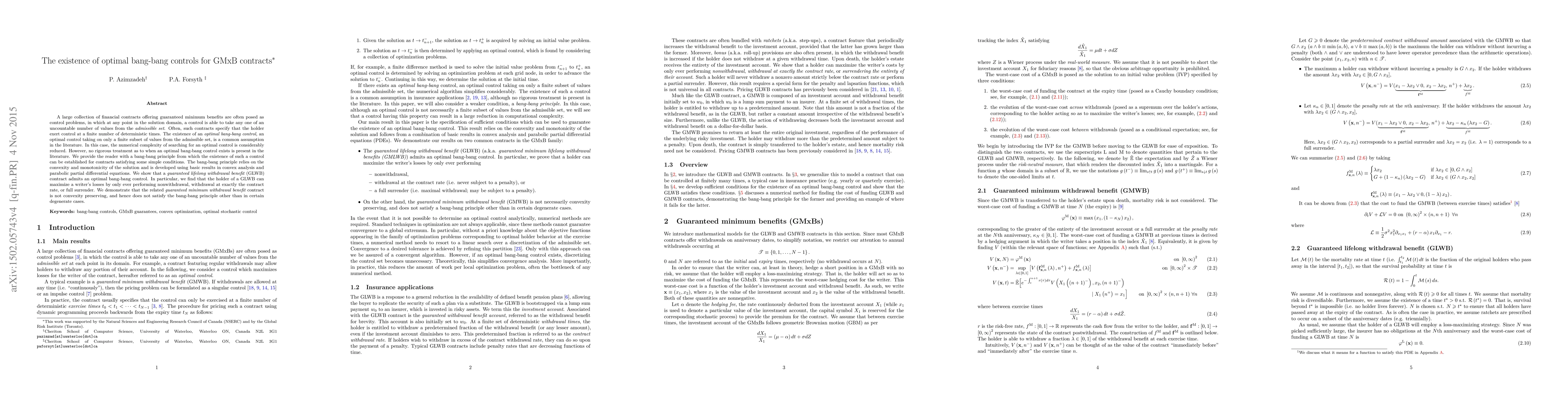 This paper establishes the existence of optimal bang-bang controls for guaranteed minimum benefit contracts, specifically for guaranteed lifelong withdrawal benefit (GLWB) contracts, using convex analysis and parabolic partial differential equations. It shows that GLWB contracts allow for optimal control by nonwithdrawal, withdrawal at the contract rate, or full surrender, while related guaranteed minimum withdrawal benefit contracts do not generally satisfy this principle.