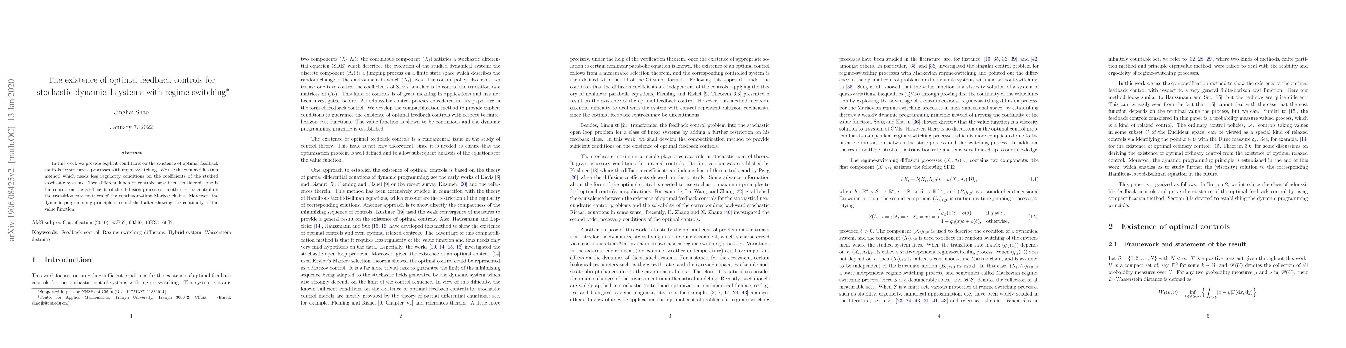 In this work we provide explicit conditions on the existence of optimal feedback controls for stochastic processes with regime-switching. We use the compactification method which needs less regularity conditions on the coefficients of the studied stochastic systems. Two different kinds of controls have been considered: one is the control on the coefficients of the diffusion processes, another is the control on the transition rate matrices of the continuous-time Markov chains. Moreover, the dynamic programming principle is established after showing the continuity of the value function.