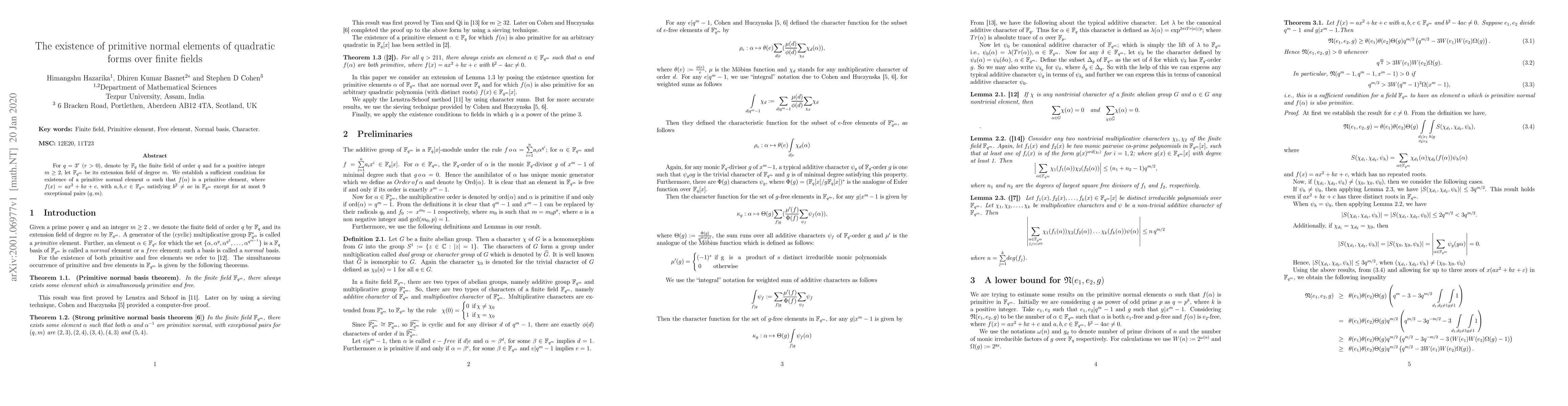 Researchers establish a condition for the existence of primitive normal elements in quadratic forms over finite fields, focusing on specific exceptions where b^2 is equal to ac.