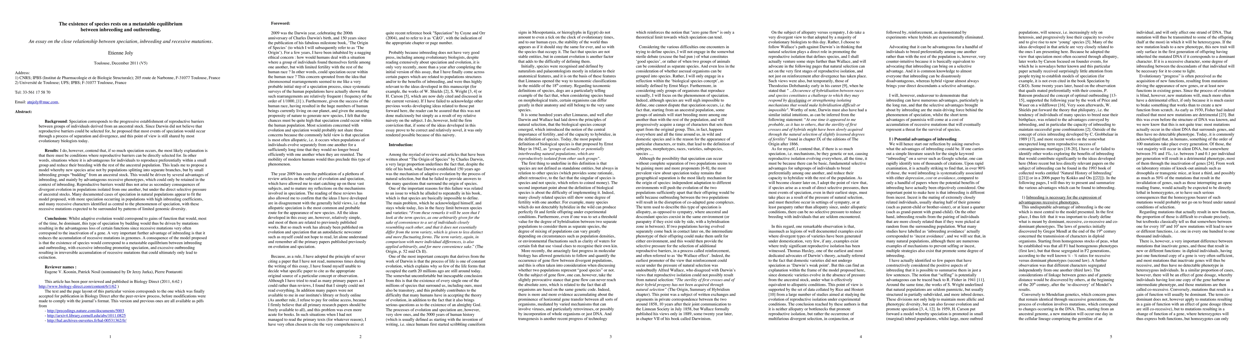 This paper proposes that speciation is driven by small inbreeding groups "budding" from ancestral populations, where advantageous recessive mutations play a key role. It suggests that species exist in a metastable equilibrium, with excessive inbreeding promoting speciation and excessive outbreeding leading to extinction due to the accumulation of recessive mutations.