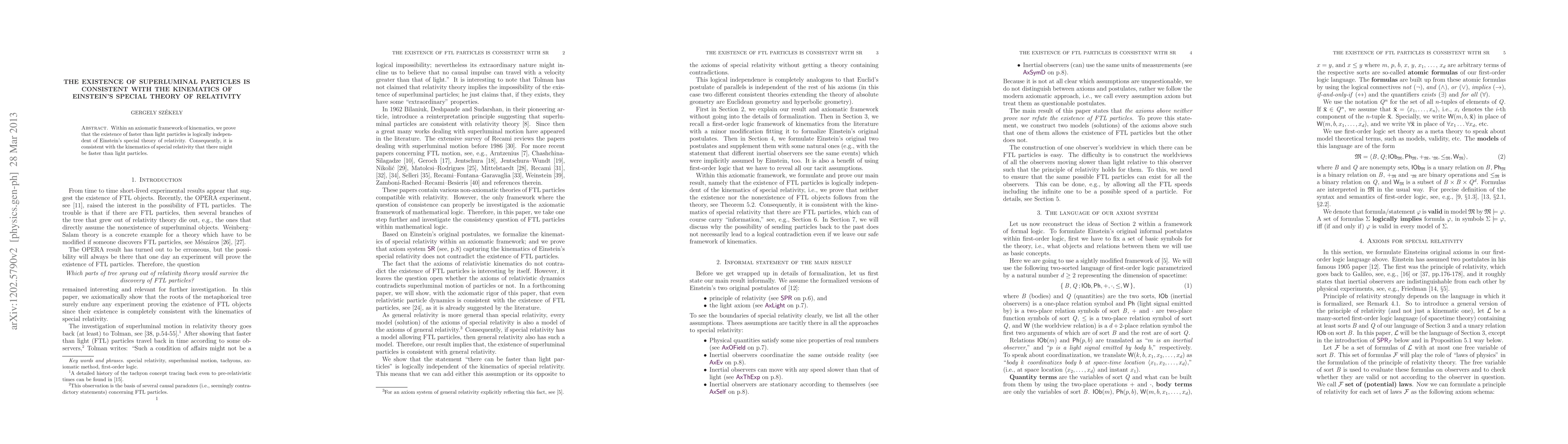 Summary: This paper demonstrates that the existence of superluminal particles does not contradict the kinematics of Einstein's special theory of relativity. It shows that the presence of faster-than-light particles is logically independent from the theory's axioms.