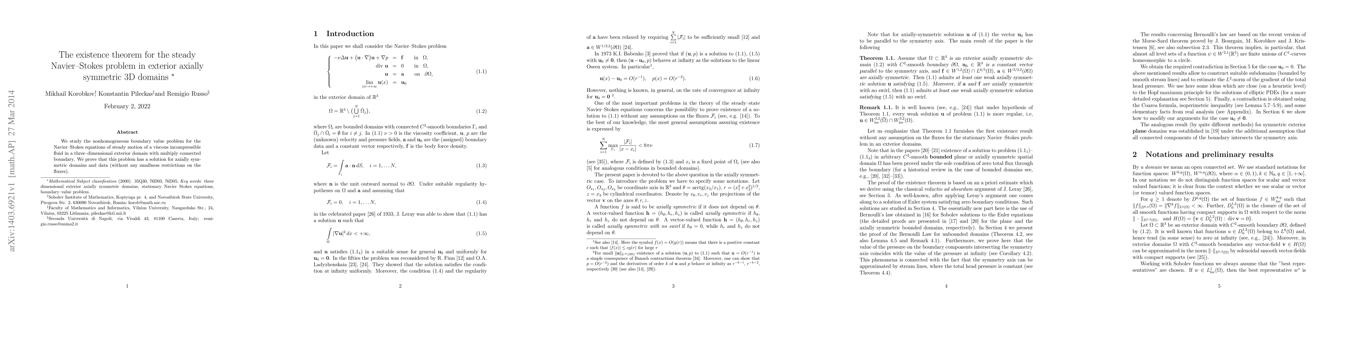 Summary: This paper proves the existence of a solution to the steady Navier-Stokes equations for viscous incompressible fluid in axially symmetric three-dimensional exterior domains, without imposing smallness restrictions on the boundary fluxes. The study focuses on multiply connected boundary conditions.