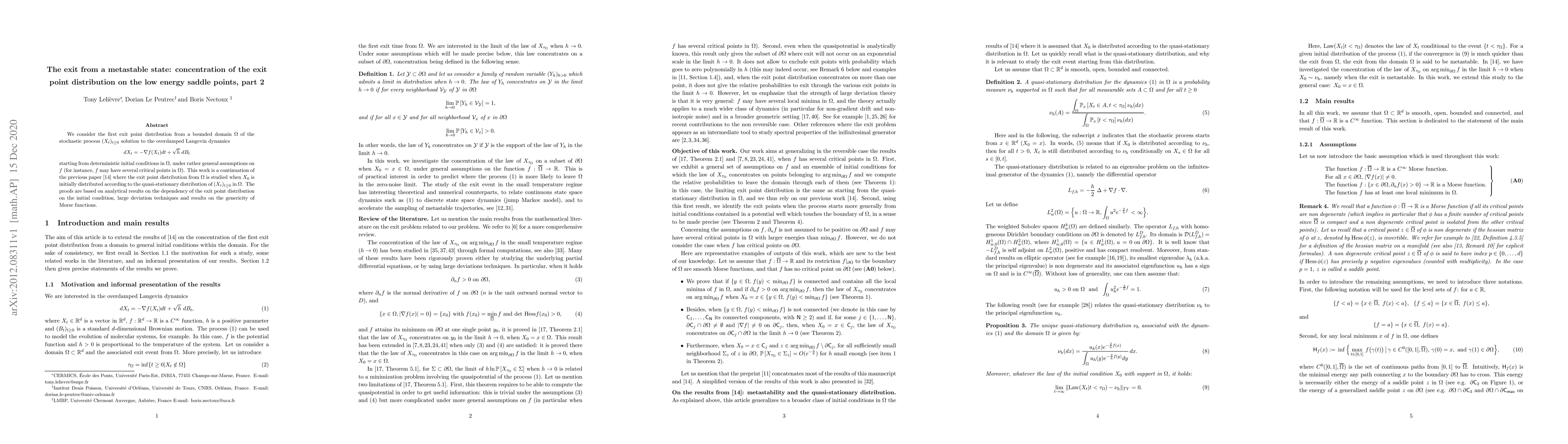 This paper studies the exit point distribution from a bounded domain of a stochastic process under overdamped Langevin dynamics, focusing on its concentration on low energy saddle points with varying initial conditions.