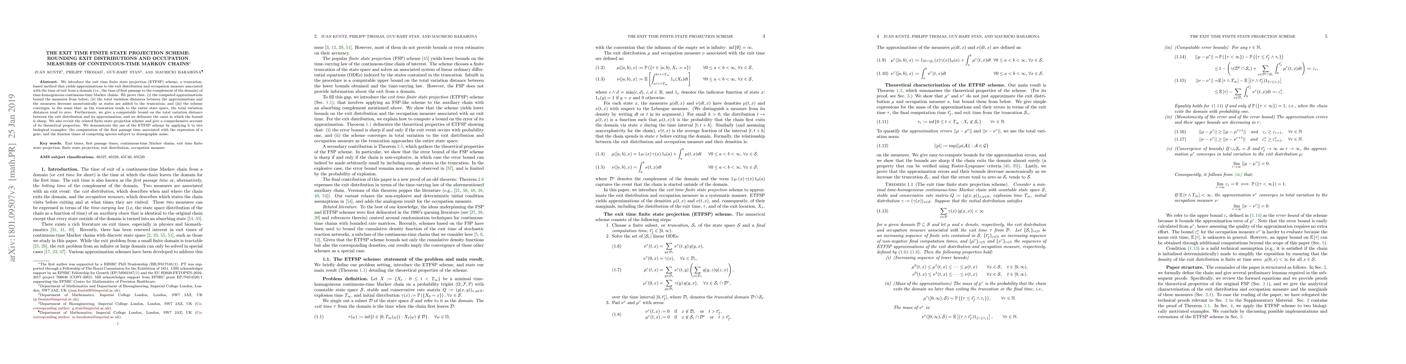 A new method called exit time finite state projection scheme approximates exit distributions and occupation measures of continuous-time Markov chains, providing bounds that improve as more states are included in the truncation.