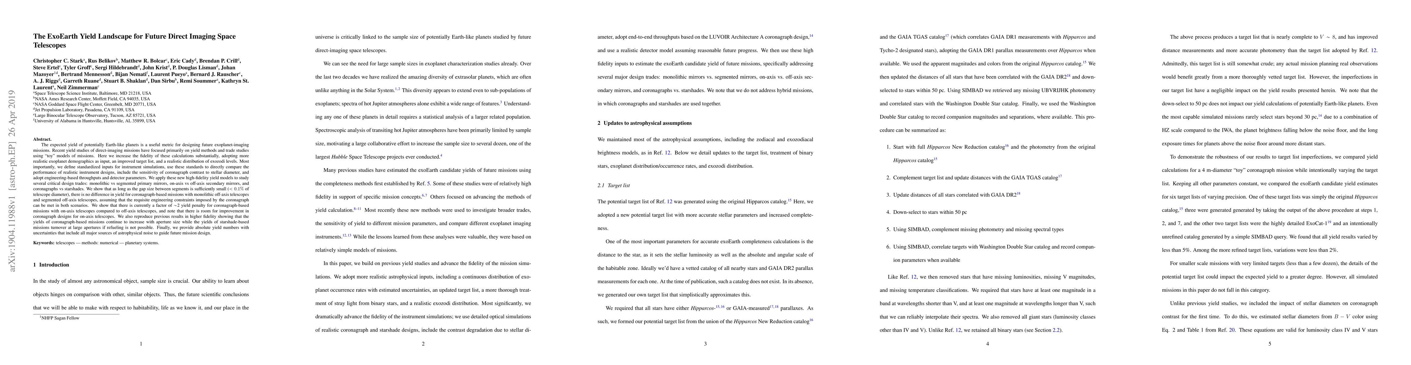 The expected yield of potentially Earth-like planets is a useful metric for designing future exoplanet-imaging missions. Recent yield studies of direct-imaging missions have focused primarily on yield methods and trade studies using "toy" models of missions. Here we increase the fidelity of these calculations substantially, adopting more realistic exoplanet demographics as input, an improved target list, and a realistic distribution of exozodi levels. Most importantly, we define standardized inputs for instrument simulations, use these standards to directly compare the performance of realistic instrument designs, include the sensitivity of coronagraph contrast to stellar diameter, and adopt engineering-based throughputs and detector parameters. We apply these new high-fidelity yield models to study several critical design trades: monolithic vs segmented primary mirrors, on-axis vs off-axis secondary mirrors, and coronagraphs vs starshades. We show that as long as the gap size between segments is sufficiently small, there is no difference in yield for coronagraph-based missions with monolithic off-axis telescopes and segmented off-axis telescopes, assuming that the requisite engineering constraints imposed by the coronagraph can be met in both scenarios. We show that there is currently a factor of ~2 yield penalty for coronagraph-based missions with on-axis telescopes compared to off-axis telescopes, and note that there is room for improvement in coronagraph designs for on-axis telescopes. We also reproduce previous results in higher fidelity showing that the yields of coronagraph-based missions continue to increase with aperture size while the yields of starshade-based missions turnover at large apertures if refueling is not possible. Finally, we provide absolute yield numbers with uncertainties that include all major sources of astrophysical noise to guide future mission design.
