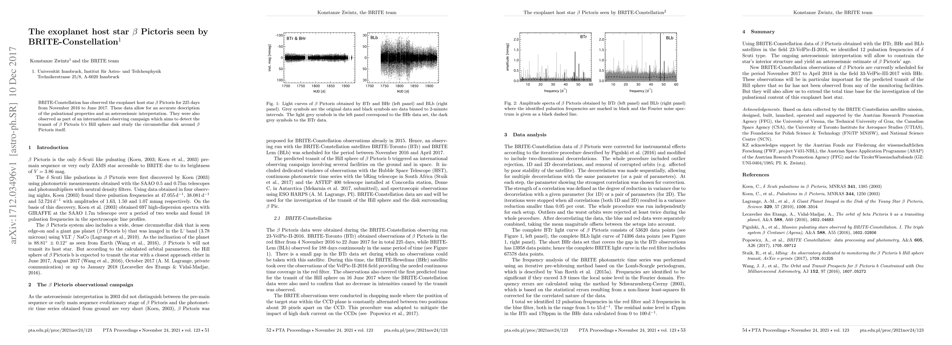 BRITE-Constellation has observed the exoplanet host star $\beta$ Pictoris for 225 days from November 2016 to June 2017. These data allow for an accurate description of the pulsational properties and an asteroseismic interpretation. They were also observed as part of an international observing campaign which aims to detect the transit of $\beta$ Pictoris b's Hill sphere and study the circumstellar disk around $\beta$ Pictoris itself.