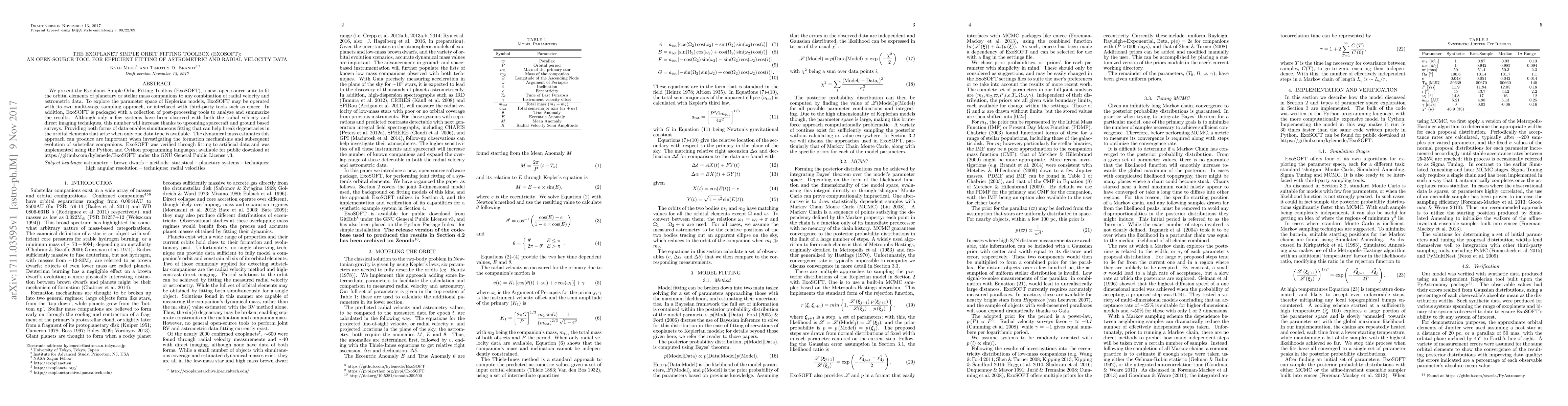 The Exoplanet Simple Orbit Fitting Toolbox (ExoSOFT) is an open-source tool designed for fitting orbital elements of exoplanets using radial velocity and astrometric data. It employs a multi-stage sampling approach and can interface with third-party tools for parameter space exploration.