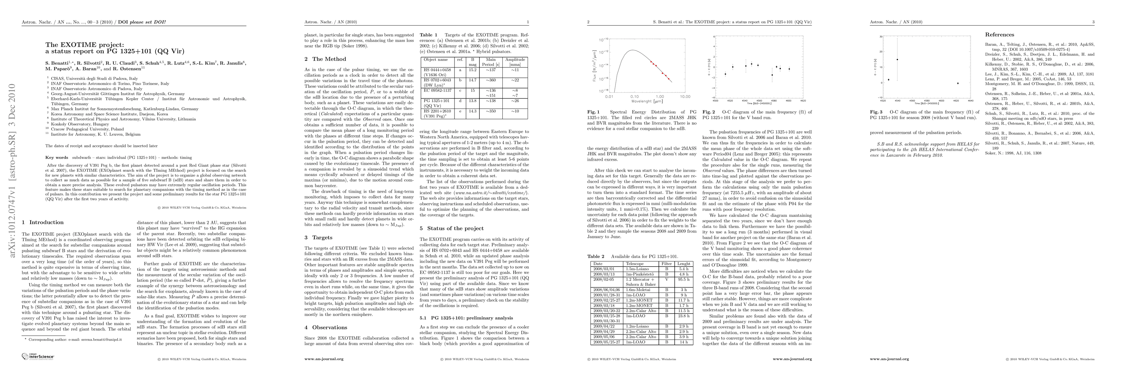 After the discovery of V391 Peg b, the first planet detected around a post Red Giant phase star (Silvotti et al. 2007), the EXOTIME (EXOplanet search with the TIming MEthod) project is focused on the search for new planets with similar characteristics. The aim of the project is to organize a global observing network to collect as much data as possible for a sample of five subdwarf B (sdB) stars and share them in order to obtain a more precise analysis. These evolved pulsators may have extremely regular oscillation periods. This feature makes these stars suitable to search for planetary companions with the timing method as in the case of pulsars. In this contribution we present the project and some preliminary results for the star PG 1325+101 (QQ Vir) after the first two years of activity.