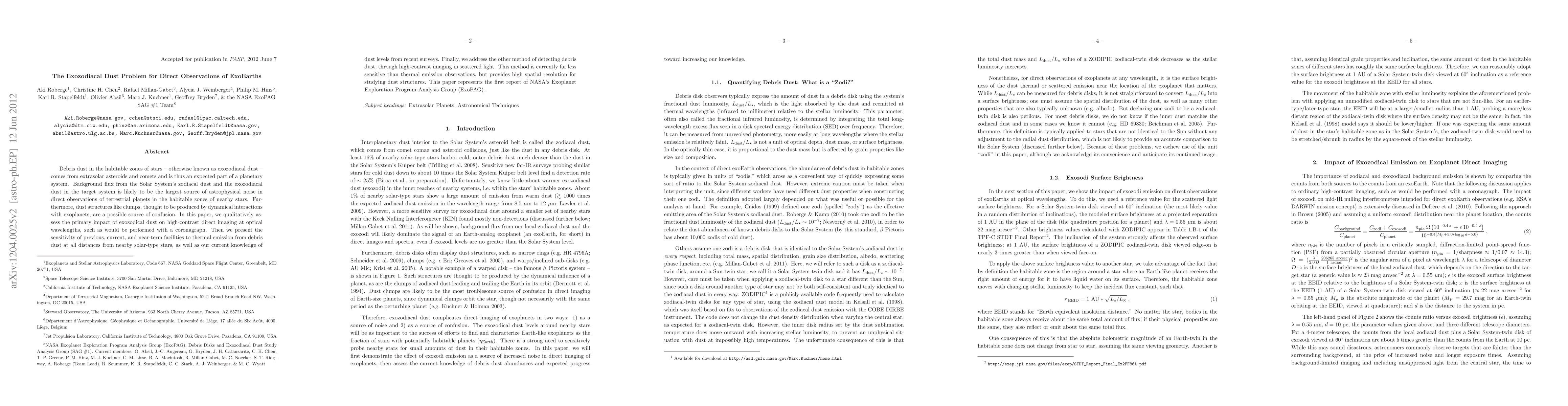 Debris dust in the habitable zones of stars - otherwise known as exozodiacal dust - comes from extrasolar asteroids and comets and is thus an expected part of a planetary system. Background flux from the Solar System's zodiacal dust and the exozodiacal dust in the target system is likely to be the largest source of astrophysical noise in direct observations of terrestrial planets in the habitable zones of nearby stars. Furthermore, dust structures like clumps, thought to be produced by dynamical interactions with exoplanets, are a possible source of confusion. In this paper, we qualitatively assess the primary impact of exozodical dust on high-contrast direct imaging at optical wavelengths, such as would be performed with a coronagraph. Then we present the sensitivity of previous, current, and near-term facilities to thermal emission from debris dust at all distances from nearby solar-type stars, as well as our current knowledge of dust levels from recent surveys. Finally, we address the other method of detecting debris dust, through high-contrast imaging in scattered light. This method is currently far less sensitive than thermal emission observations, but provides high spatial resolution for studying dust structures. This paper represents the first report of NASA's Exoplanet Exploration Program Analysis Group (ExoPAG).