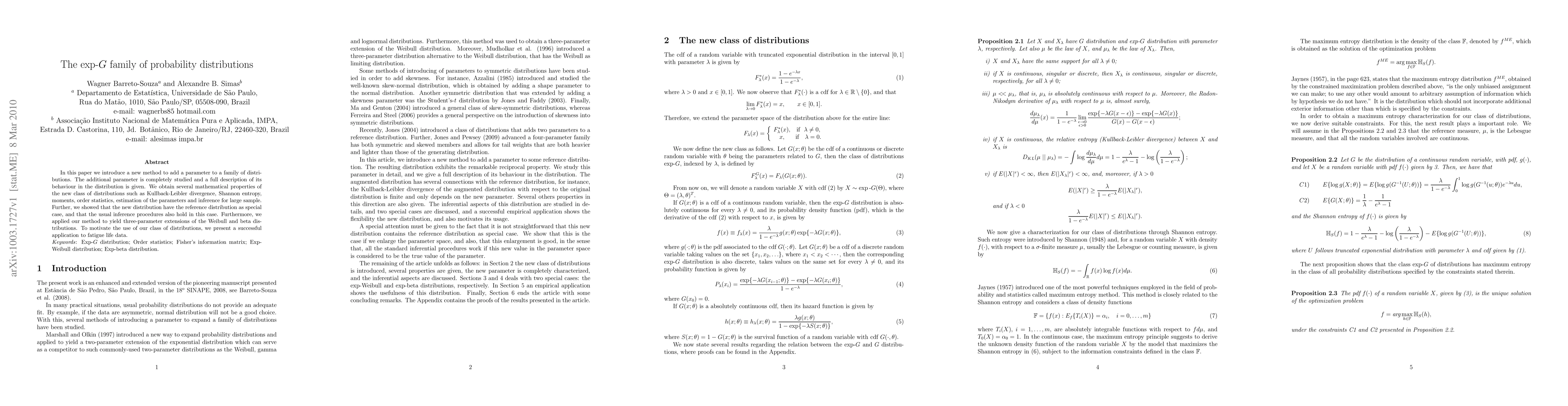 In this paper we introduce a new method to add a parameter to a family of distributions. The additional parameter is completely studied and a full description of its behaviour in the distribution is given. We obtain several mathematical properties of the new class of distributions such as Kullback-Leibler divergence, Shannon entropy, moments, order statistics, estimation of the parameters and inference for large sample. Further, we showed that the new distribution have the reference distribution as special case, and that the usual inference procedures also hold in this case. Furthermore, we applied our method to yield three-parameter extensions of the Weibull and beta distributions. To motivate the use of our class of distributions, we present a successful application to fatigue life data.
