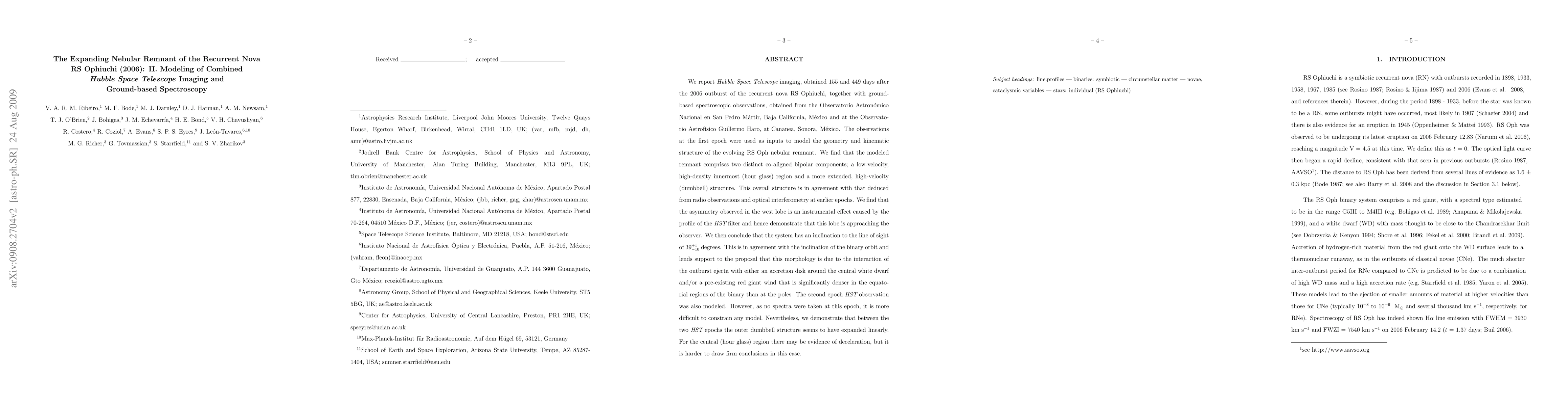 This study combines Hubble Space Telescope imaging and ground-based spectroscopy to model the nebular remnant of the recurrent nova RS Ophiuchi post-2006 outburst. The findings reveal a two-component structure consisting of a dense inner hourglass and an extended outer dumbbell, with the latter expanding linearly over time.