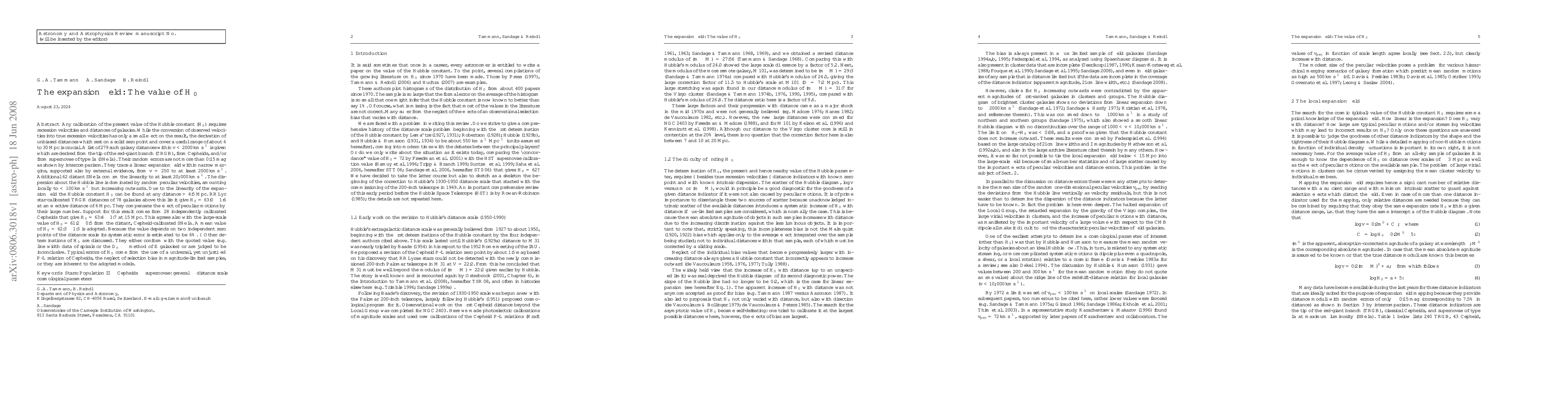 Any calibration of the present value of the Hubble constant requires recession velocities and distances of galaxies. While the conversion of observed velocities into true recession velocities has only a small effect on the result, the derivation of unbiased distances which rest on a solid zero point and cover a useful range of about 4-30 Mpc is crucial. A list of 279 such galaxy distances within v<2000 km/s is given which are derived from the tip of the red-giant branch (TRGB), from Cepheids, and from supernovae of type Ia (SNe Ia). Their random errors are not more than 0.15 mag as shown by intercomparison. They trace a linear expansion field within narrow margins from v=250 to at least 2000 km/s. Additional 62 distant SNe Ia confirm the linearity to at least 20,000 km/s. The dispersion about the Hubble line is dominated by random peculiar velocities, amounting locally to <100 km/s but increasing outwards. Due to the linearity of the expansion field the Hubble constant H_0 can be found at any distance >4.5 Mpc. RR Lyr star-calibrated TRGB distances of 78 galaxies above this limit give H_0=63.0+/-1.6 at an effective distance of 6 Mpc. They compensate the effect of peculiar motions by their large number. Support for this result comes from 28 independently calibrated Cepheids that give H_0=63.4+/-1.7 at 15 Mpc. This agrees also with the large-scale value of H_0=61.2+/-0.5 from the distant, Cepheid-calibrated SNe Ia. A mean value of H_0=62.3+/-1.3 is adopted. Because the value depends on two independent zero points of the distance scale its systematic error is estimated to be 6%. Typical errors of H_0 come from the use of a universal, yet unjustified P-L relation of Cepheids, the neglect of selection bias in magnitude-limited samples, or they are inherent to the adopted models.