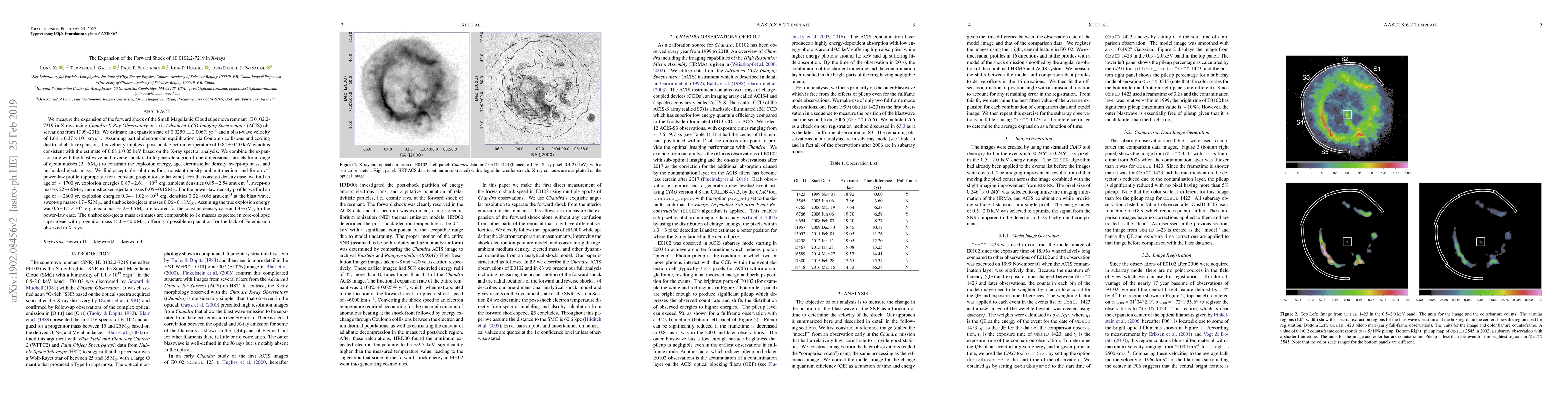 We measure the expansion of the forward shock of the Small Magellanic Cloud supernova remnant 1E\,0102.2-7219 in X-rays using Chandra X-Ray Observatory on-axis Advanced CCD Imaging Spectromete(ACIS) observations from 1999-2016. We estimate an expansion rate of 0.025%\pm0.006%yr^{-1} and a blast-wave velocity of 1.61\pm0.37\times10^3 km s^{-1}. Assuming partial electron-ion equilibration via Coulomb collisions and cooling due to adiabatic expansion, this velocity implies a postshock electron temperature of 0.84\pm0.20 keV which is consistent with the estimate of 0.68\pm0.05 keV based on the X-ray spectral analysis. We combine the expansion rate with the blast wave and reverse shock radii to generate a grid of one-dimensional models for a range of ejecta masses (2-6 \msol) to constrain the explosion energy, age, circumstellar density, swept-up mass, and unshocked-ejecta mass. We find acceptable solutions for a constant density ambient medium and for an r^{-2} power-law profile (appropriate for a constant progenitor stellar wind). For the constant density case, we find an age of \sim 1700 yr, explosion energies 0.87-2.61\times10^{51} erg, ambient densities 0.85-2.54 amu cm^{-3}, swept-up masses 22-66 \msol, and unshocked-ejecta masses 0.05-0.16 \msol. For the power-law density profile, we find an age of \sim 2600 yr, explosion energies 0.34-1.02\times10^{51} erg, densities 0.22-0.66 amu cm^{-3} at the blast wave, swept-up masses 17-52 \msol, and unshocked-ejecta masses 0.06-0.18 \msol. Assuming the true explosion energy was 0.5-1.5\times10^{51} erg, ejecta masses 2-3.5 \msol are favored for the constant density case and 3-6 \msol for the power-law case. The unshocked-ejecta mass estimates are comparable to Fe masses expected in core-collapse supernovae with progenitor mass 15.0-40.0 \msol, offering a possible explanation for the lack of Fe emission observed in X-rays.
