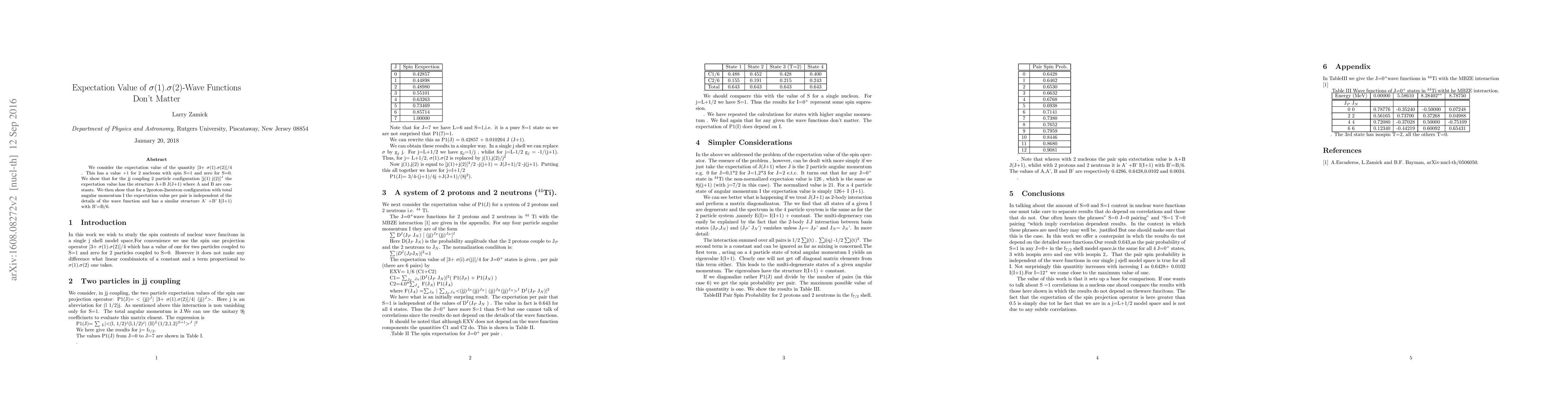 We consider the expectation value of the quantity [3+ \sigma (1).\sigma (2)]/4 . This has a value +1 for 2 nucleons with spin S=1and zero for S=0. We show that for the jj coupling 2 particle configuration [j(1) j(2)]^{J} the expectation value has the structure A+B J(J+1) where A and B are constants. We then show that for a 2proton-2neutron configuration with total angular momentum I the expectation value per pair is independent of the details of the wave function and has a similar structure A' +B' I(I+1) with B'=B/6.