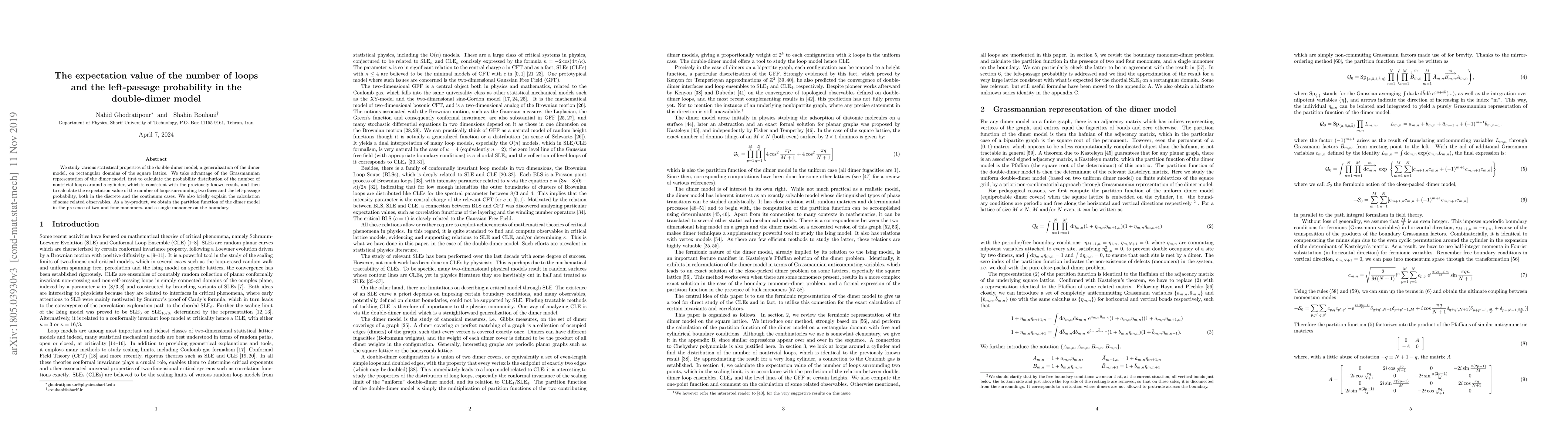 We study various statistical properties of the double-dimer model, a generalization of the dimer model, on rectangular domains of the square lattice. We take advantage of the Grassmannian representation of the dimer model, first to calculate the probability distribution of the number of nontrivial loops around a cylinder, which is consistent with the previously known result, and then to calculate the expectation value of the number of loops surrounding two faces and the left-passage probability, both in the discrete and the continuum cases. We also briefly explain the calculation of some related observables. As a by-product, we obtain the partition function of the dimer model in the presence of two and four monomers, and a single monomer on the boundary.