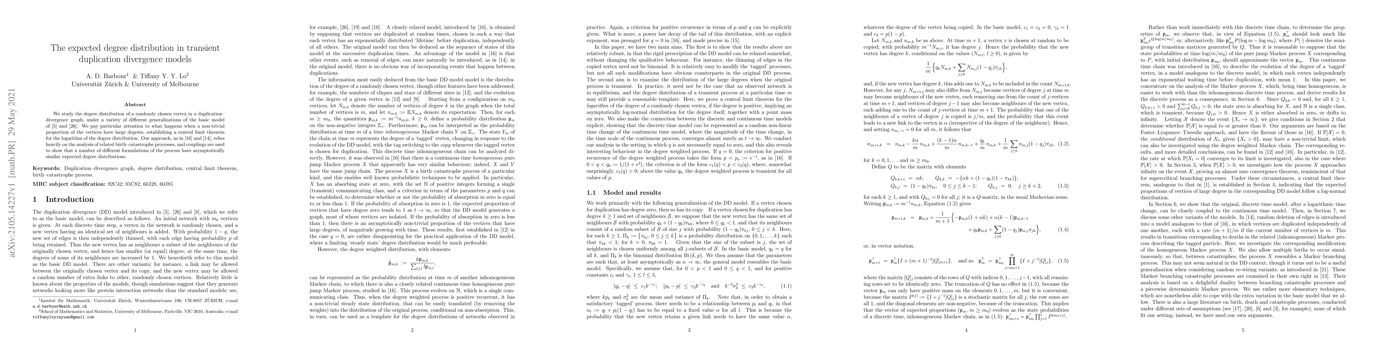 This paper investigates the degree distribution in transient duplication-divergence models, focusing on how large degrees emerge in a non-trivial proportion of vertices. It establishes a central limit theorem for the logarithm of the degree distribution and demonstrates the asymptotic similarity of various model formulations through birth-catastrophe process analysis.
