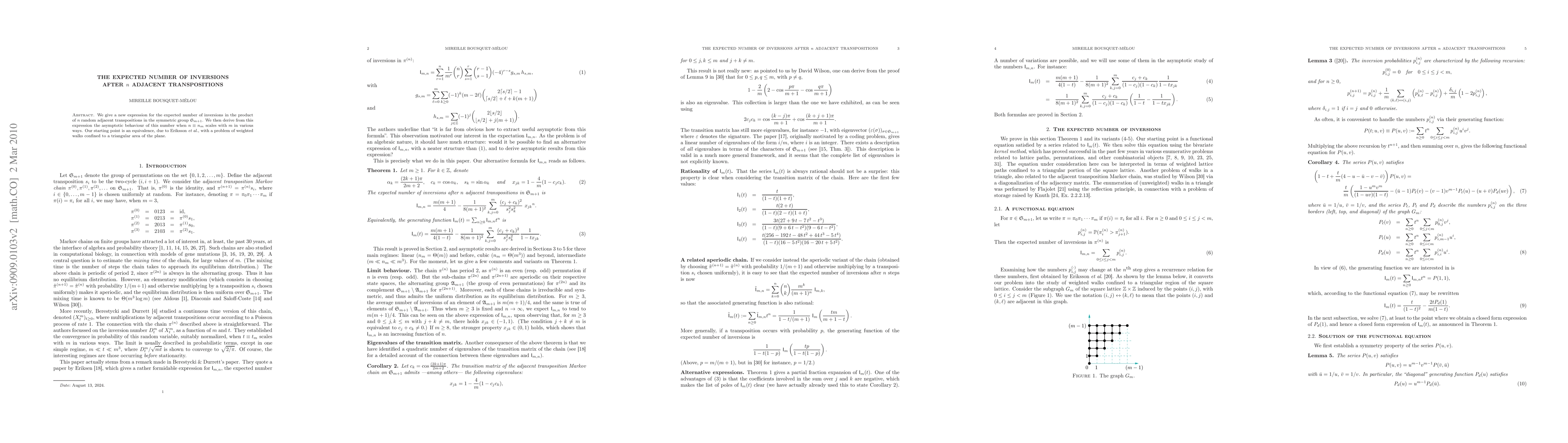 We give a new expression for the expected number of inversions in the product of n random adjacent transpositions in the symmetric group S_{m+1}. We then derive from this expression the asymptotic behaviour of this number when n scales with m in various ways. Our starting point is an equivalence, due to Eriksson et al., with a problem of weighted walks confined to a triangular area of the plane.