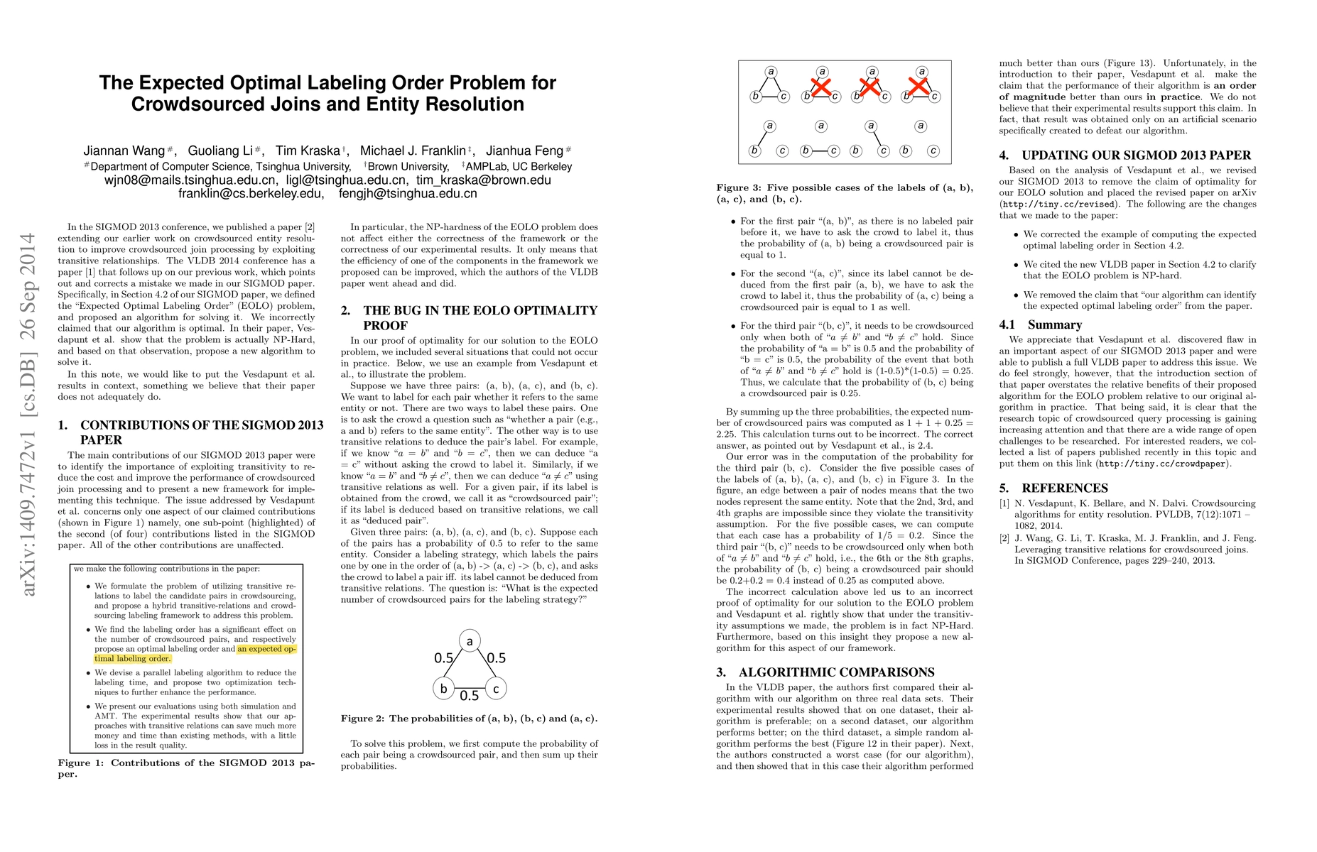 In the SIGMOD 2013 conference, we published a paper extending our earlier work on crowdsourced entity resolution to improve crowdsourced join processing by exploiting transitive relationships [Wang et al. 2013]. The VLDB 2014 conference has a paper that follows up on our previous work [Vesdapunt et al., 2014], which points out and corrects a mistake we made in our SIGMOD paper. Specifically, in Section 4.2 of our SIGMOD paper, we defined the "Expected Optimal Labeling Order" (EOLO) problem, and proposed an algorithm for solving it. We incorrectly claimed that our algorithm is optimal. In their paper, Vesdapunt et al. show that the problem is actually NP-Hard, and based on that observation, propose a new algorithm to solve it. In this note, we would like to put the Vesdapunt et al. results in context, something we believe that their paper does not adequately do.