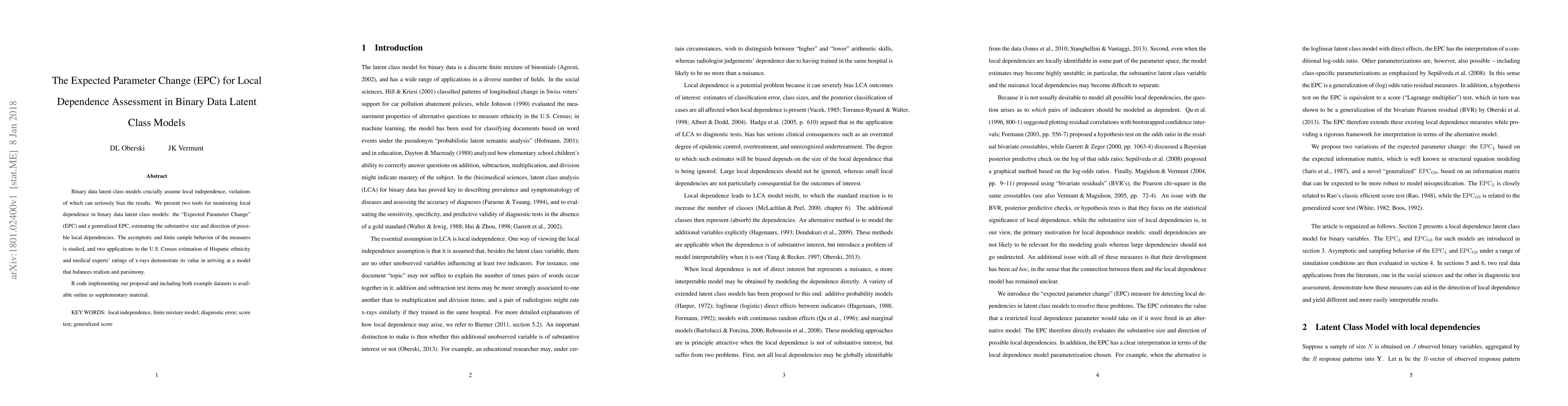 This paper introduces the "Expected Parameter Change" (EPC) and a generalized EPC to assess local dependence in binary data latent class models, demonstrating their effectiveness through applications in U.S. Census data and medical expert ratings, thereby aiding in achieving a balance between model realism and simplicity.