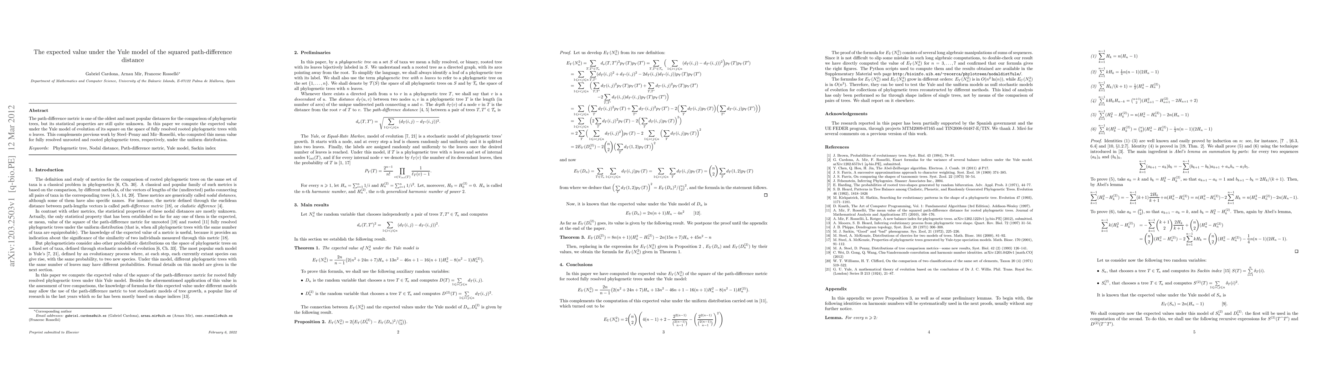This paper calculates the expected value of the squared path-difference distance under the Yule model for fully resolved rooted phylogenetic trees, extending previous work by Steel-Penny and Mir-Rosselló on unrooted and rooted trees under uniform distribution.