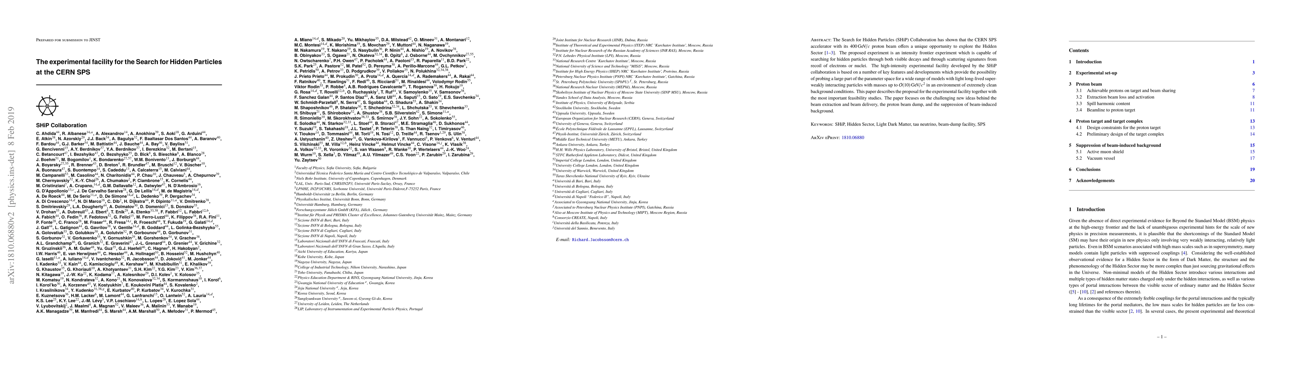 The Search for Hidden Particles (SHiP) Collaboration has shown that the CERN SPS accelerator with its 400 $\mathrm{\small GeV/c}$ proton beam offers a unique opportunity to explore the Hidden Sector. The proposed experiment is an intensity frontier experiment which is capable of searching for hidden particles through both visible decays and through scattering signatures from recoil of electrons or nuclei. The high-intensity experimental facility developed by the SHiP collaboration is based on a number of key features and developments which provide the possibility of probing a large part of the parameter space for a wide range of models with light long-lived superweakly interacting particles with masses up to O(10) $\mathrm{\small GeV/c^2}$ in an environment of extremely clean background conditions. This paper describes the proposal for the experimental facility together with the most important feasibility studies. The paper focuses on the challenging new ideas behind the beam extraction and beam delivery, the proton beam dump, and the suppression of beam-induced background.