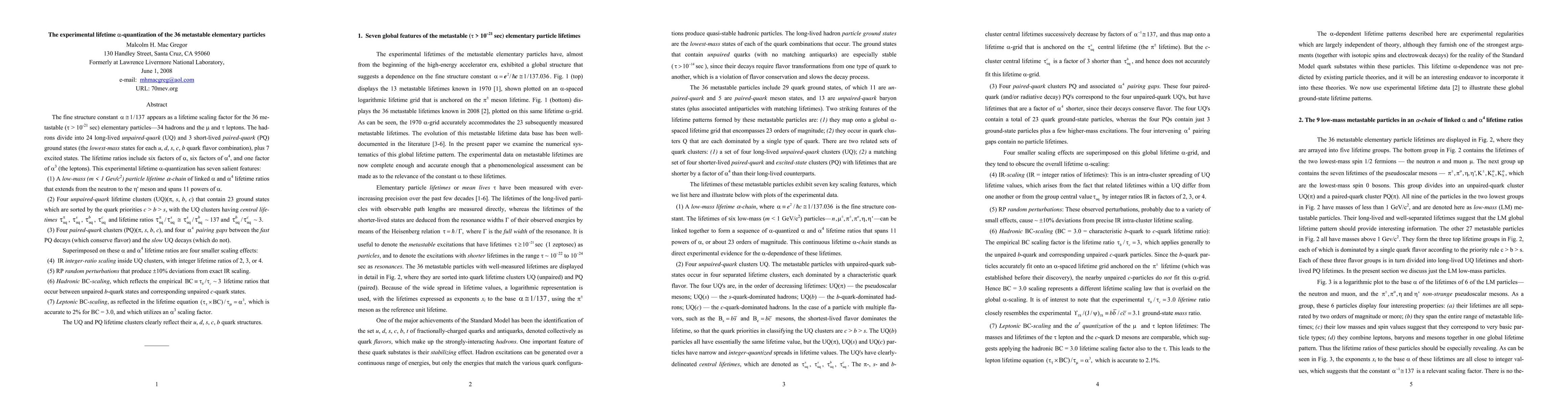 The fine structure constant alpha ~ 1/137 appears as a lifetime scaling factor for the 36 metastable (t > 10^-21 sec) elementary particles -- 34 hadrons and the mu and tau leptons. The hadrons divide into 24 long-lived unpaired-quark (UQ) and 3 short-lived paired-quark (PQ) ground states (the lowest-mass states for each u, d, s, c, b quark flavor combination), plus 7 excited states. The lifetime ratios include six factors of alpha, six factors of alpha^4, and one factor of alpha^3 (the leptons). This experimental lifetime alpha-quantization has seven salient features, where (1)-(3) show powers of alpha and (4)-(7) show smaller scaling effects): (1) A low-mass (m < 1 Gev) particle alpha-chain of linked alpha and alpha^4 lifetime ratios that extends from the neutron to the eta' meson and spans 11 powers of alpha. (2) Four unpaired-quark lifetime clusters (UQ)(pi, s, b, c) that contain 23 ground states which are sorted by the quark priorities c > b > s. (3) Four paired-quark clusters (PQ)(pi, s, b, c), and four alpha^4 pairing gaps between the fast PQ decays (which conserve flavor) and the slow UQ decays (which do not). (4) IR integer-ratio scaling inside UQ clusters, with integer lifetime ratios of 2, 3, or 4. (5) RP random perturbations that produce ~10% deviations from exact IR scaling. (6) Hadronic BC-scaling, which reflects the empirical BC = t(b)/t(c) ~ 3 lifetime ratios that occur between unpaired b-quark states and corresponding unpaired c-quark states. (7) Leptonic BC-scaling, shown in the lifetime equation (t(tau) x BC) / t(mu) = alpha^3, which is accurate to 2% for BC = 3.0, and which utilizes an alpha^3 scaling factor. The UQ and PQ lifetime clusters clearly reflect their u, d, s, c, b quark substructures