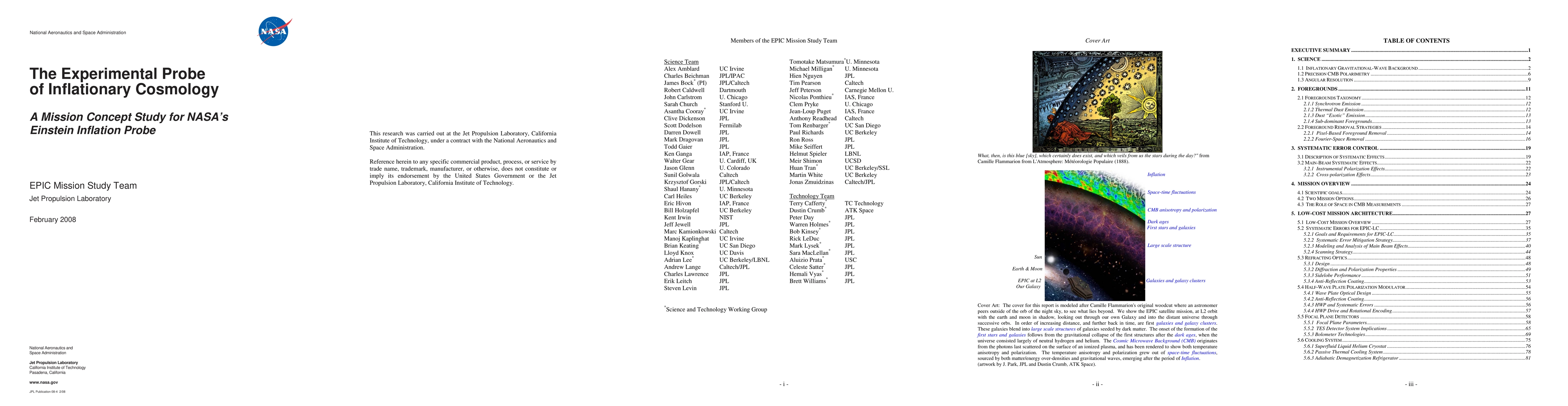 The Experimental Probe of Inflationary Cosmology (EPIC) mission concept study explores the feasibility of measuring foregrounds, controlling systematic errors, and achieving required optics performance for a future NASA mission. The current Phase 2 target is a ~2m aperture mission that balances sensitivity and cost with a smaller and larger alternative options.