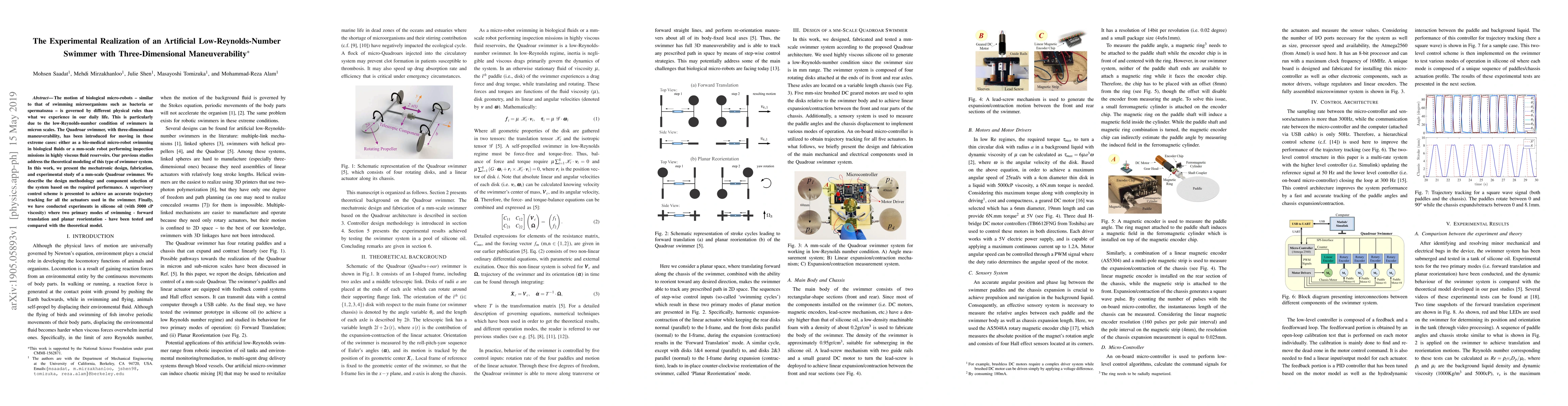 The motion of biological micro-robots -- similar to that of swimming microorganisms such as bacteria or spermatozoa -- is governed by different physical rules than what we experience in our daily life. This is particularly due to the low-Reynolds-number condition of swimmers in micron scales. The Quadroar swimmer, with three-dimensional maneuverability, has been introduced for moving in these extreme cases: either as a bio-medical micro-robot swimming in biological fluids or a mm-scale robot performing inspection missions in highly viscous fluid reservoirs. Our previous studies address the theoretical modeling of this type of swimmer system. In this work, we present the mechatronic design, fabrication, and experimental study of a mm-scale Quadroar swimmer. We describe the design methodology and component selection of the system based on the required performance. A supervisory control scheme is presented to achieve an accurate trajectory tracking for all the actuators used in the swimmer. Finally, we have conducted experiments in silicone oil (with 5000 cP viscosity) where two primary modes of swimming - forward translation and planar reorientation - have been tested and compared with the theoretical model.