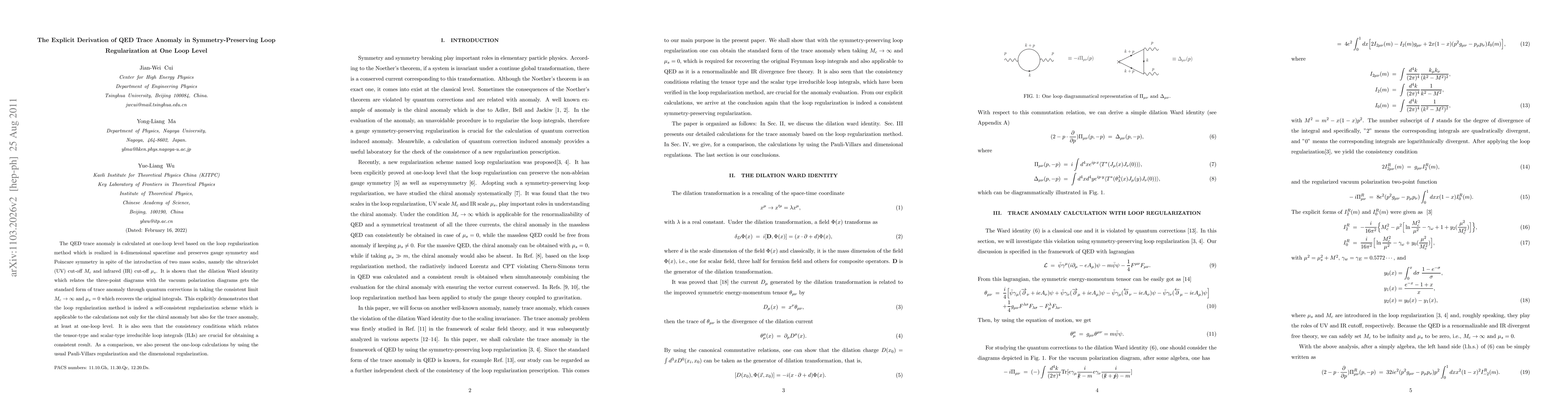 This paper derives the QED trace anomaly at one-loop level using symmetry-preserving loop regularization, showing it recovers the standard form through quantum corrections. The method is demonstrated as a self-consistent regularization scheme applicable to both chiral and trace anomalies, emphasizing the importance of consistency conditions for tensor-type and scalar-type irreducible loop integrals.