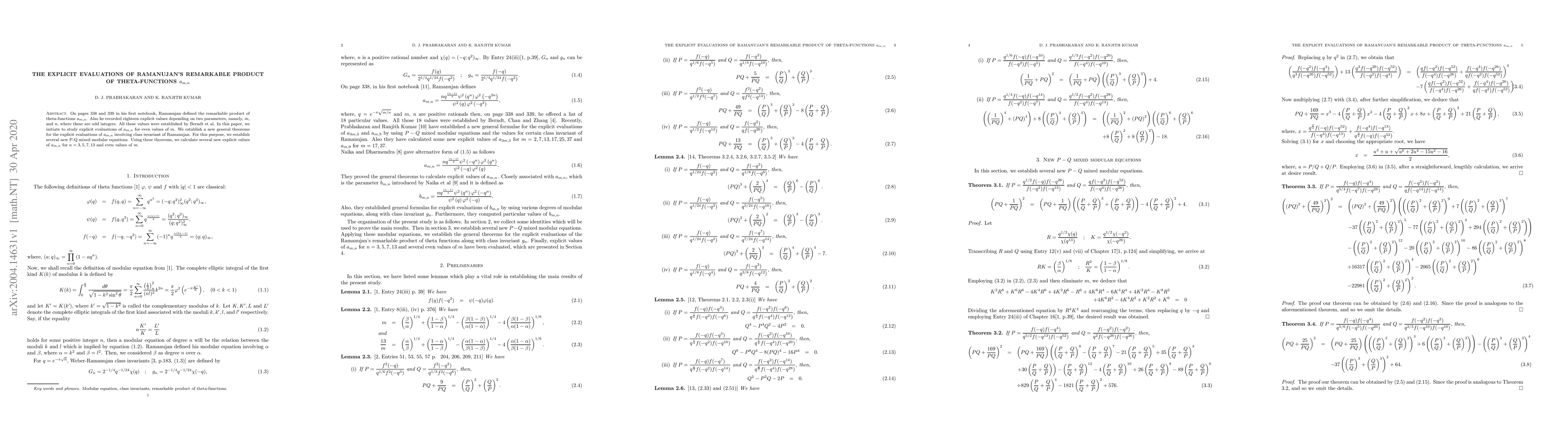 On pages 338 and 339 in his first notebook, Ramanujan defined the remarkable product of theta-functions $a_{m, n}$. Also he recorded eighteen explicit values depending on two parameters, namely, $m$, and $n$, where these are odd integers. All these values were established by Berndt et al. In this paper, we initiate to study explicit evaluations of $a_{m, n}$ for even values of $m$. We establish a new general theorems for the explicit evaluations of $a_{m, n}$ involving class invariant of Ramanujan. For this purpose, we establish several new P-Q mixed modular equations. Using these theorems, we calculate several new explicit values of $a_{m, n}$ for $n = 3, 5, 7, 13$ and even values of $m$.