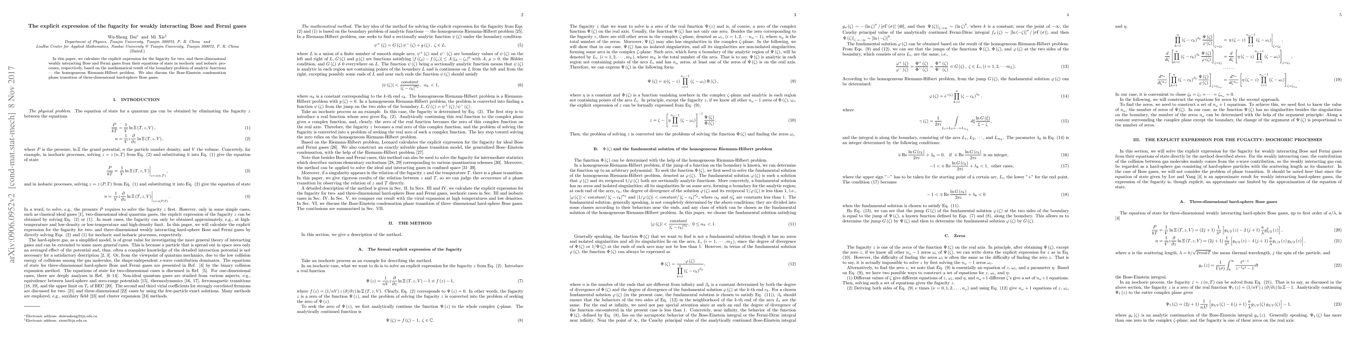 In this paper, we calculate the explicit expression for the fugacity for two- and three-dimensional weakly interacting Bose and Fermi gases from their equations of state in isochoric and isobaric processes, respectively, based on the mathematical result of the boundary problem of analytic functions --- the homogeneous Riemann-Hilbert problem. We also discuss the Bose-Einstein condensation phase transition of three-dimensional hard-sphere Bose gases.