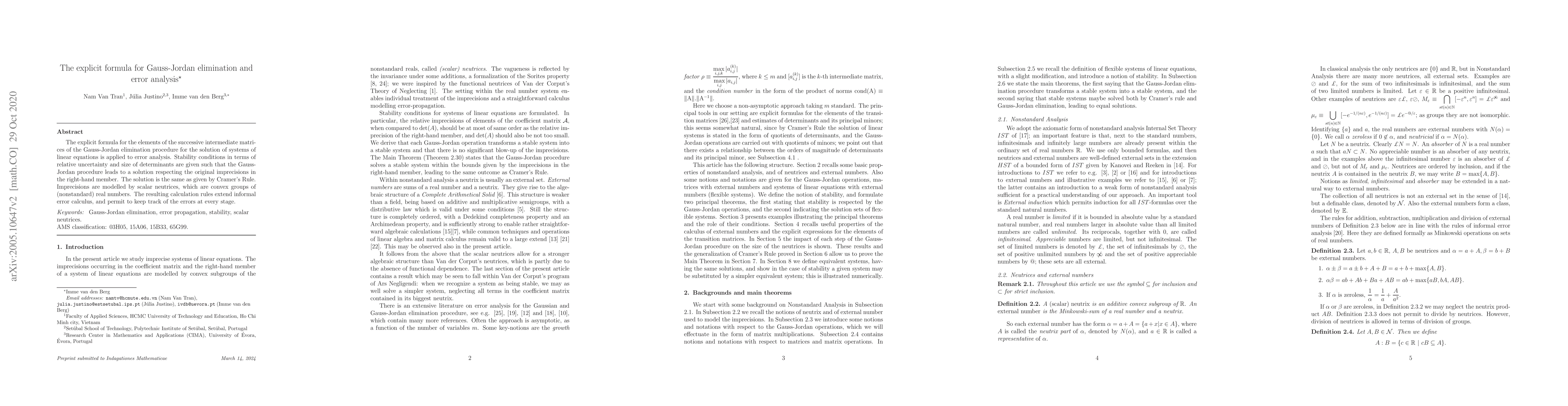 This paper derives an explicit formula for the Gauss-Jordan elimination process and uses it to analyze errors, ensuring stability under relative uncertainty and determinant size. The method maintains accuracy while respecting initial imprecisions, yielding solutions equivalent to those from Cramer's Rule.