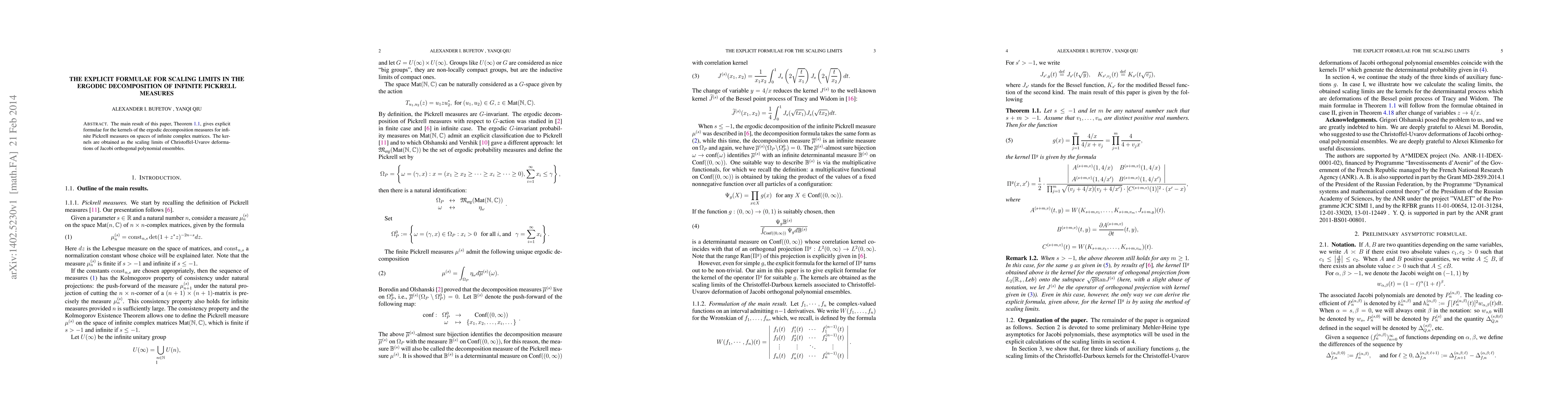 This paper presents explicit formulae for the ergodic decomposition measures of infinite Pickrell measures, derived as scaling limits of Christoffel-Uvarov deformations of Jacobi orthogonal polynomial ensembles on spaces of infinite complex matrices. Theorem 1.1 highlights these results.