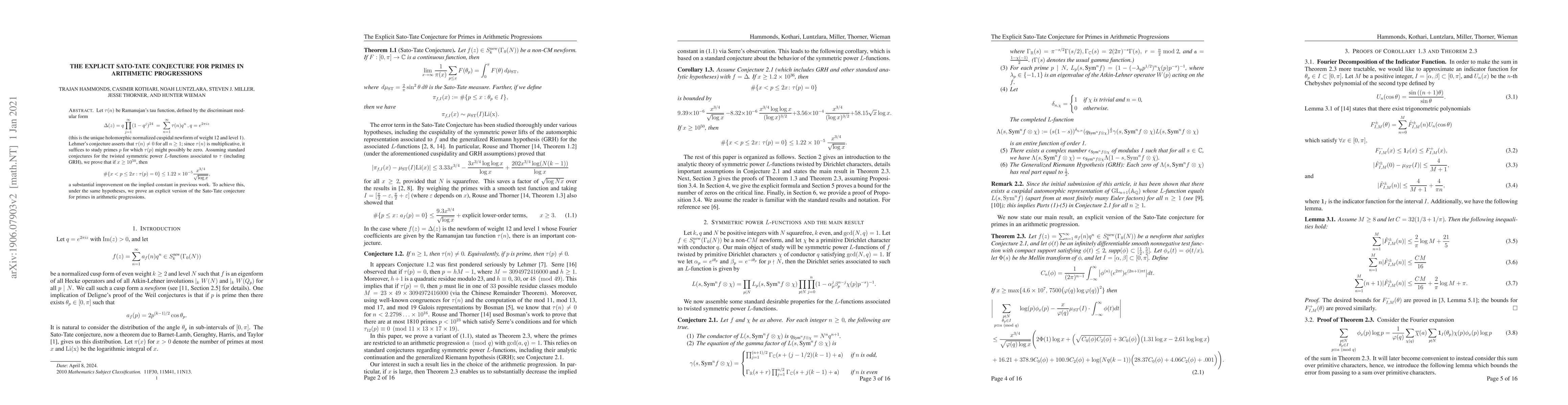 Let $\tau(n)$ be Ramanujan's tau function, defined by the discriminant modular form \[ \Delta(z) = q\prod_{j=1}^{\infty}(1-q^{j})^{24}\ =\ \sum_{n=1}^{\infty}\tau(n) q^n \,,q=e^{2\pi i z} \] (this is the unique holomorphic normalized cuspidal newform of weight 12 and level 1). Lehmer's conjecture asserts that $\tau(n)\neq 0$ for all $n\geq 1$; since $\tau(n)$ is multiplicative, it suffices to study primes $p$ for which $\tau(p)$ might possibly be zero. Assuming standard conjectures for the twisted symmetric power $L$-functions associated to $\tau$ (including GRH), we prove that if $x\geq 10^{50}$, then \[ \#\{x < p\leq 2x: \tau(p) = 0\} \leq 1.22 \times 10^{-5} \frac{x^{3/4}}{\sqrt{\log x}},\] a substantial improvement on the implied constant in previous work. To achieve this, under the same hypotheses, we prove an explicit version of the Sato-Tate conjecture for primes in arithmetic progressions.