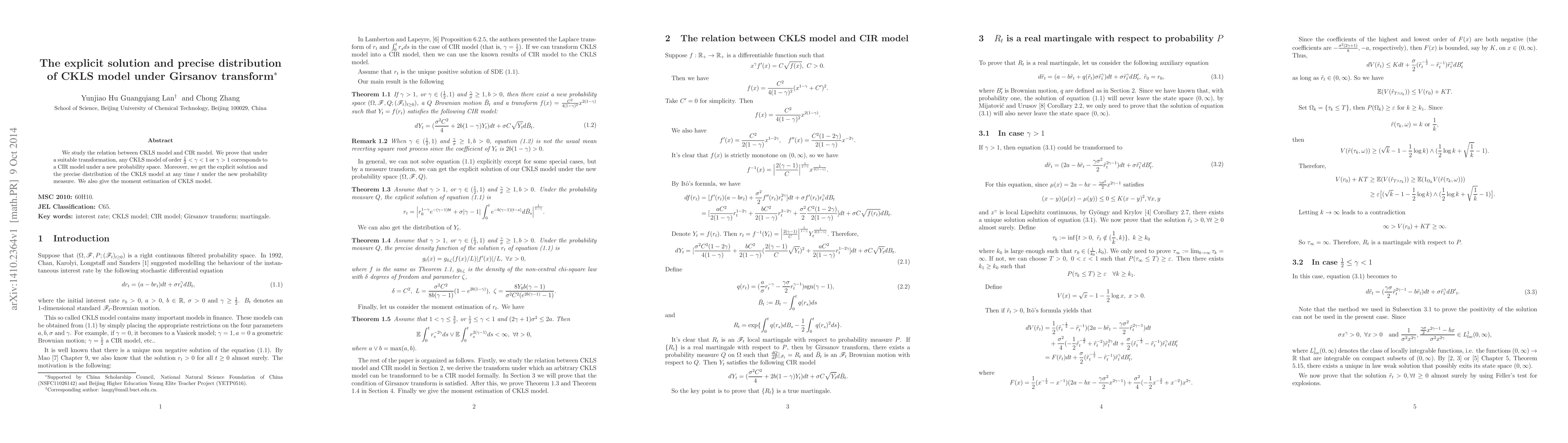 We study the relation between CKLS model and CIR model. We prove that under a suitable transformation, any CKLS model of order $\frac{1}{2}<\gamma<1$ or $\gamma> 1$ corresponds to a CIR model under a new probability space. Moreover, we get the explicit solution and the precise distribution of the CKLS model at any time $t$ under the new probability measure. We also give the moment estimation of CKLS model.