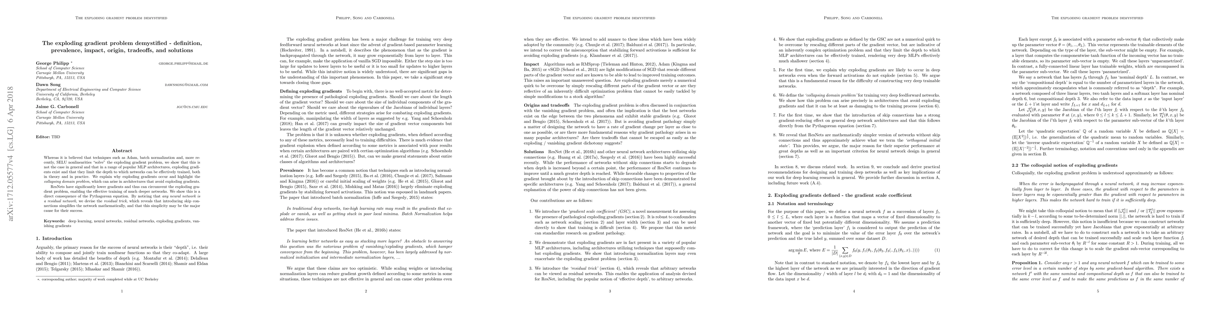 Whereas it is believed that techniques such as Adam, batch normalization and, more recently, SeLU nonlinearities "solve" the exploding gradient problem, we show that this is not the case in general and that in a range of popular MLP architectures, exploding gradients exist and that they limit the depth to which networks can be effectively trained, both in theory and in practice. We explain why exploding gradients occur and highlight the *collapsing domain problem*, which can arise in architectures that avoid exploding gradients. ResNets have significantly lower gradients and thus can circumvent the exploding gradient problem, enabling the effective training of much deeper networks. We show this is a direct consequence of the Pythagorean equation. By noticing that *any neural network is a residual network*, we devise the *residual trick*, which reveals that introducing skip connections simplifies the network mathematically, and that this simplicity may be the major cause for their success.