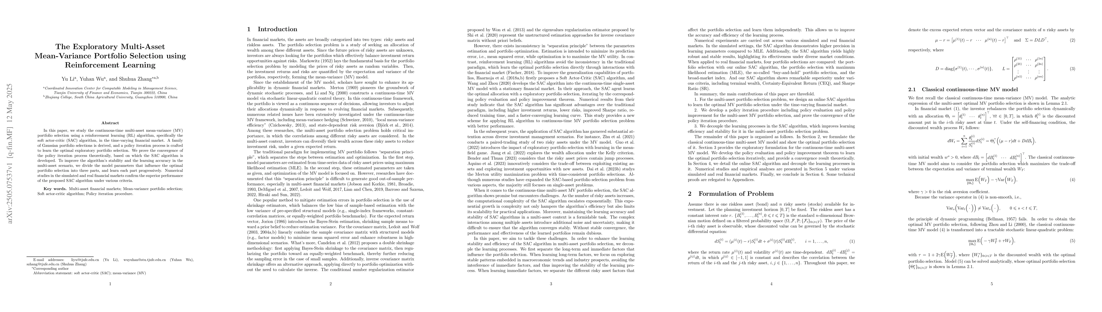 The research employs the soft actor-critic (SAC) algorithm, a reinforcement learning technique, to study continuous-time multi-asset mean-variance portfolio selection in time-varying financial markets. A policy iteration process is developed to learn optimal exploratory portfolios, with model parameters divided into three parts for progressive learning.