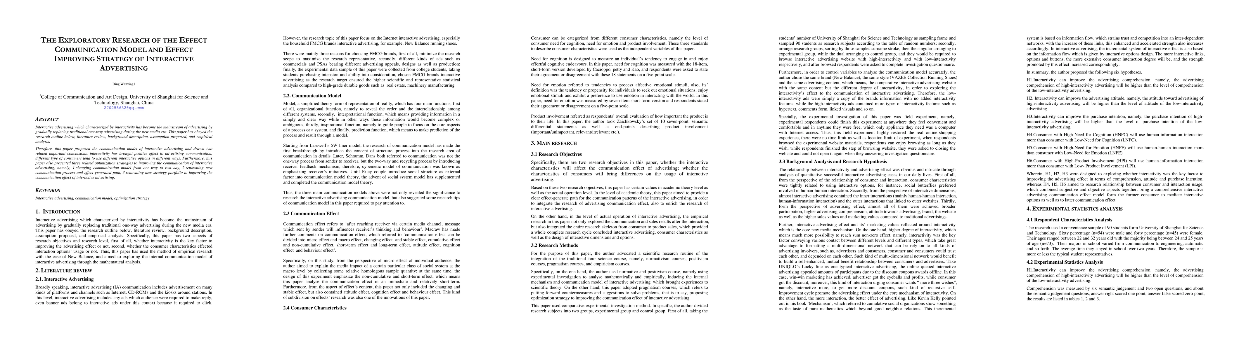 This paper explores the communication model of interactive advertising, finding that interactivity enhances advertising communication. It also identifies consumer preferences for different interactive options and proposes three strategies to optimize interactive advertising communication: shifting to a two-way model, revamping the communication process, and enhancing strategy portfolios.