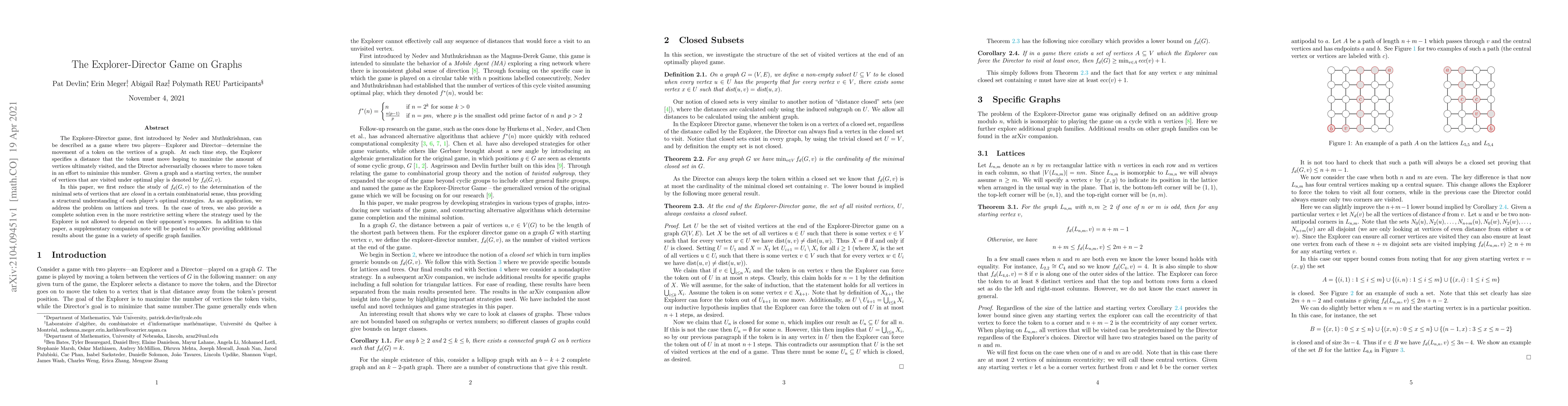 This paper explores the Explorer-Director game on graphs, where two players determine a token's movement to maximize or minimize visited vertices. It reduces the problem to finding minimal closed sets, providing insights into optimal strategies and solving the problem for lattices, trees, and specific graph families.