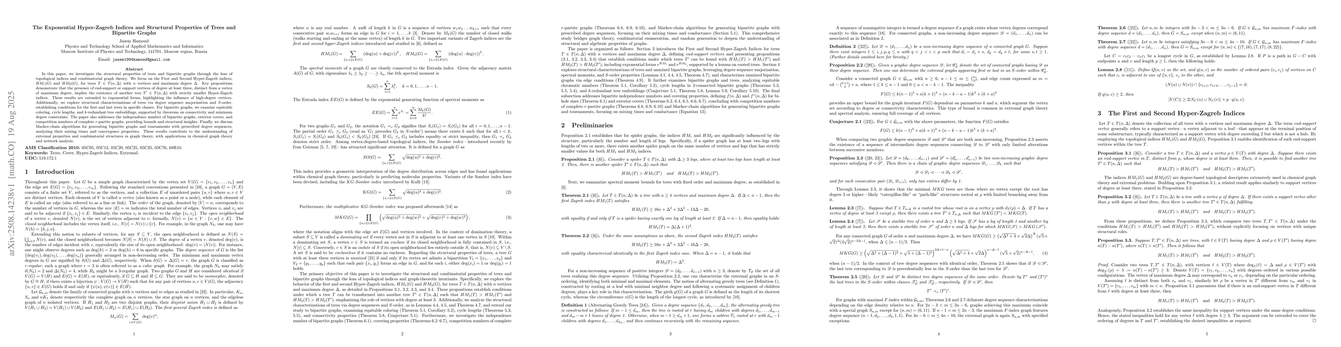 In this paper, we investigate the structural properties of trees and bipartite graphs through the lens of topological indices and combinatorial graph theory. We focus on the First and Second Hyper-Zagreb indices, $HM_1(G)$ and $HM_2(G)$, for trees $T \in T(n, \Delta)$ with $n$ vertices and maximum degree $\Delta$. Key propositions demonstrate that the presence of end-support or support vertices of degree at least three, distinct from a vertex of maximum degree, implies the existence of another tree $T' \in T(n, \Delta)$ with strictly smaller Hyper-Zagreb indices. These results are extended to exponential forms, highlighting the influence of high-degree vertices. Additionally, we explore structural characterizations of trees via degree sequence majorization and $S$-order, establishing conditions for the first and last trees in specific classes. For bipartite graphs, we examine equitable coloring, cycle lengths, and $k$-redundant tree embeddings, supported by theorems on connectivity and minimum degree constraints. The paper also addresses the independence number of bipartite graphs, exterior covers, and competition numbers of complete $r$-partite graphs, providing bounds and structural insights. Finally, we discuss Markov-chain algorithms for generating bipartite graphs and tournaments with prescribed degree sequences, analyzing their mixing times and convergence properties. These results contribute to the understanding of extremal properties and combinatorial structures in graph theory, with applications in chemical graph theory and network analysis.