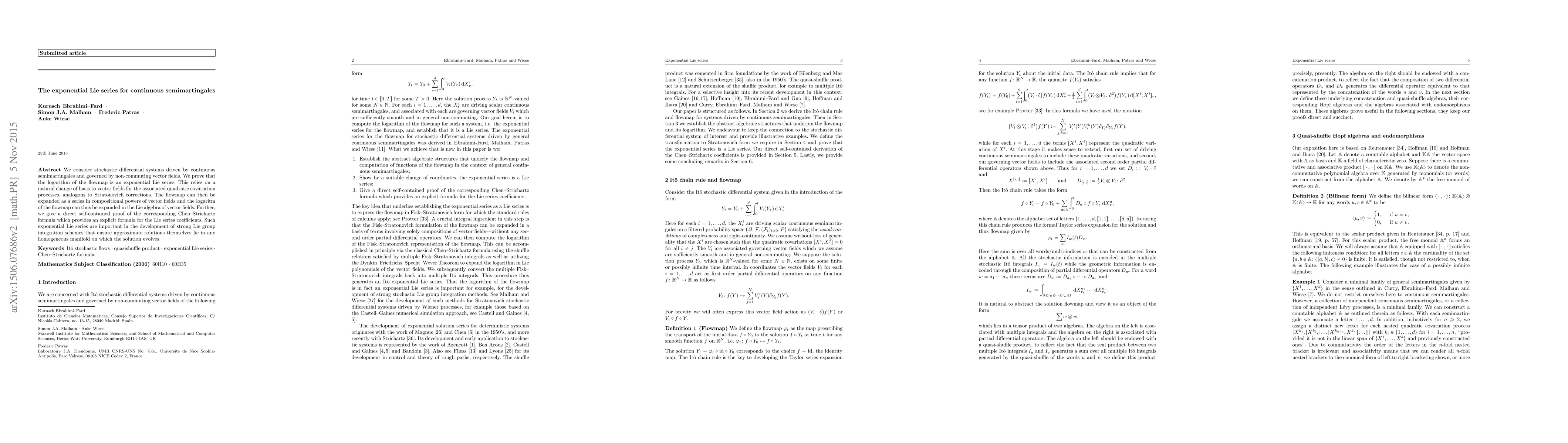 This paper proves that the logarithm of the flowmap for stochastic differential systems driven by continuous semimartingales is an exponential Lie series, utilizing a change of basis analogous to Stratonovich corrections. It also provides a direct proof of the Chen-Strichartz formula, which is crucial for developing strong Lie group integration schemes ensuring approximate solutions lie within the evolving homogeneous manifold.
