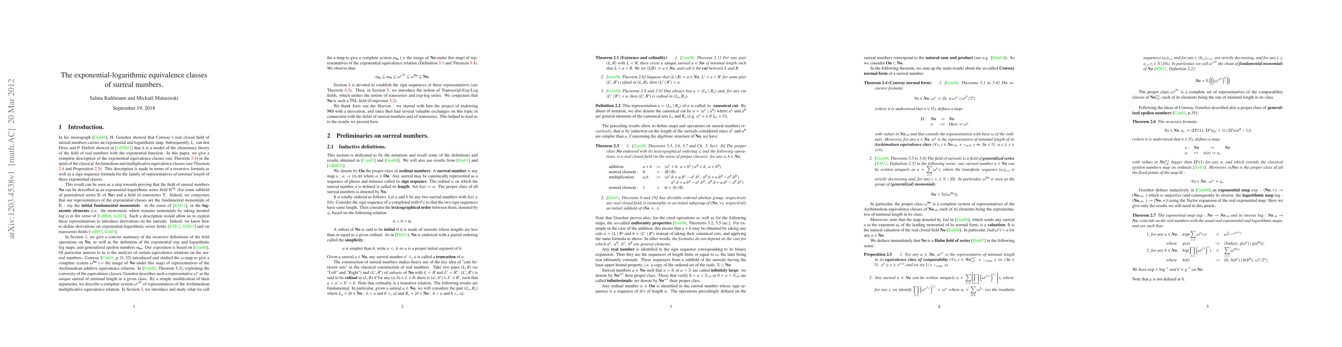 The paper describes a recursive formula and a sign sequence formula for the family of representatives of minimal length of exponential equivalence classes in surreal numbers, building on previous work by H. Gonshor, L. van den Dries, and P. Ehrlich.